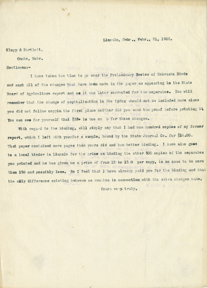 Lincoln, Nebr., Febr., 21, 1905. Klopp & Bartlett Omaha, Nebr. Gentlemen:- I have taken the time to go over the Preliminary Review of Nebraska Birds and mark all of the changes that have been made in the paper as appearing in the State Board of Agriculture report and as it was later corrected for the separates. You will remember that the change of capitalization in the index should not be included here since you did not follow copyin the first place neither did you send the proof before printing it. You can see for youself that $33+ is too much for these changes. With regard to the binding, will simply say that I had one hundred copies of my former report, which I left with you for a sample, bound by the State Journal Co. for $16.00. That paper contained more pages than yours did and has better binding. I have also gone to a local binder in Lincoln for the price on binding the other 500 copies of the separates you printed and he has given me a price of from 12 to 15 cents per copy, in no case to be more than 15 cents and possibly less. So I feel that I have already paid you for the binding and that the only difference existing between us remains in connection with the extra charges made. Yours very truly,