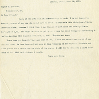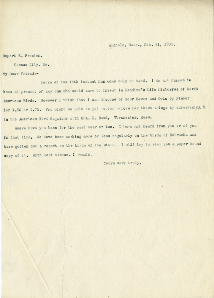 Lincoln, Nebr., Mch. 21, 1905. Rupert E. Preston, Kansas City, Mo. My Dear Friend:- Yours of the 15th instant has come duly to hand. I do not happen to know at present of any one who would care to invest in Bendira's Life Histories of North American Birds. However I think that I can dispose of your Hawks and Owls by Fisher for 1.50 or 1.75. You might be able to get better prices for these things by advertising in the American Bird Magazine with Cha. K. Reed, Worchester, Mass. Where have you been for the past year or two. I have not heard from you or of you in that time. We have been working more or less regularly on the birds of Nebraska and have gotten out a report on the birds of the state. I will try to send you a paper bound copy of it. With best wishes, I remain, Yours very truly,