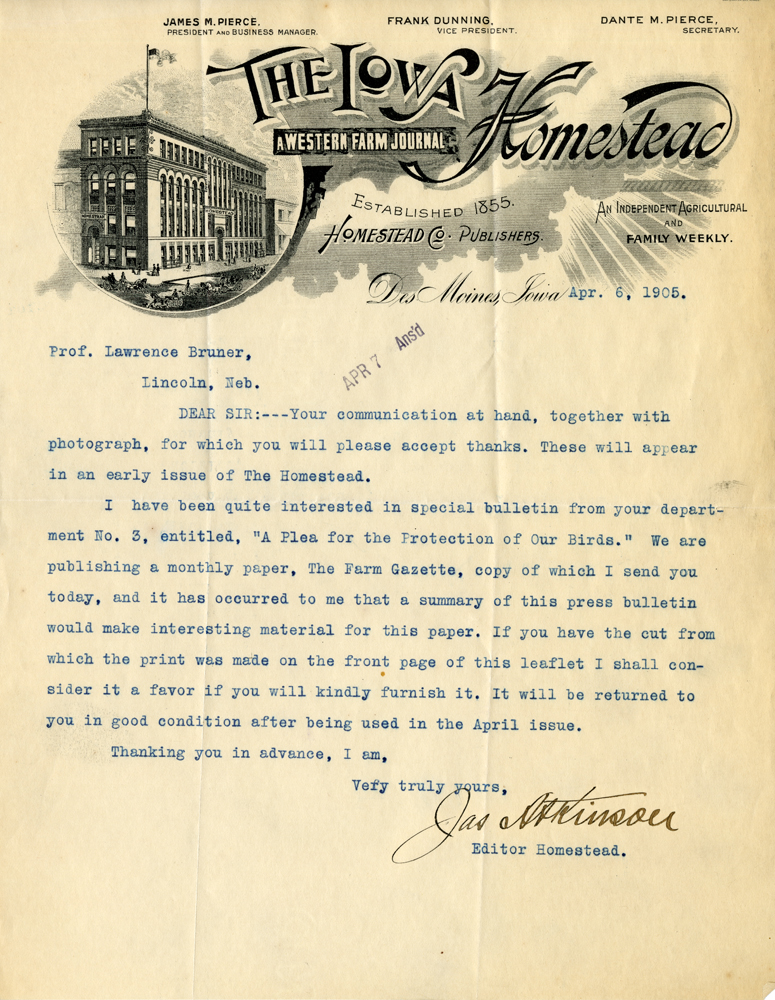 James M. Pierce President and Business Manager Frank Dunning Vice President Dante M. Pierce Secretary The Iowa Homestead A Western Farm Journal Established 1855. Homestead Co. Publishers. An Independent Agricultural and Family Weekly. Des Moines, Iowa Apr. 6, 1905. Apr 7 Ans'd Prof. Lawrence Bruner, Lincoln, Neb. DEAR SIR:---Your communication at hand, together with photograph, for which you will please accept thanks. These will appear in an early issue of The Homestead. I have been quite interested in special bulletin from your department No. 3, entitled, "A Plea for the Protection of Our Birds." We are publishing a monthly paper, The Farm Gazette, copy of which I send you today, and it has occurred to me that a summary of this press bulletin would make interesting material for this paper. If you have the cut from which the print was made on the front page of this leaflet I shall consider it a favor if you will kindly furnish it. It will be returned to you in good condition after being used in the April issue. Thanking you in advance, I am, Very truly yours, Jas. Atkinson Editor Homestead. DEAR SIR:---Your communication at hand, together with photograph, for which you will please accept thanks. These will appear in an early issue of The Homestead. I have been quite interested in special bulletin from your department No. 3, entitled, "A Plea for the Protection of Our Birds." We are publishing a monthly paper, The Farm Gazette, copy of which I send you today, and it has occurred to me that a summary of this press bulletin would make interesting material for this paper. If you have a cut from which the print was made on the front page of this leaflet I shall consider it a favor if you will kindly furnish it. It will be returned to you in good condition after being used in the April issue. Thanking you in advance, I am, Very truly yours, Jas Editor Homestead.