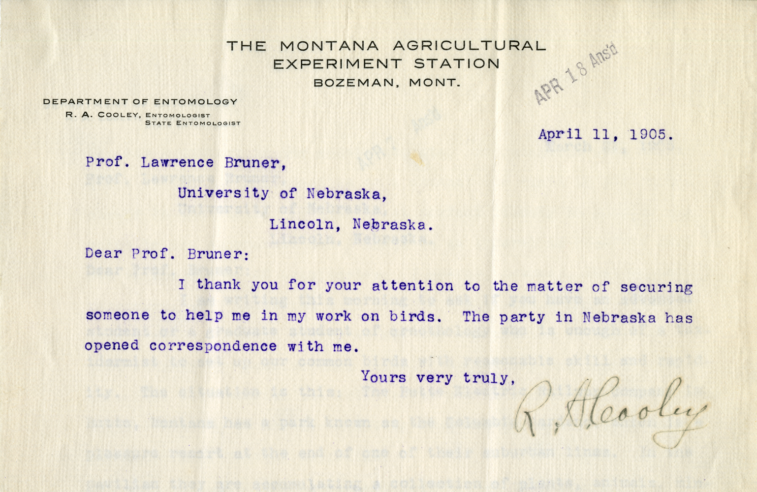 The Montana Agricultural Experiment Station Bozeman, Mont. Department of Entomology R.A. Cooley, Entomologist State Entomologist April 18 Ans'd April 11, 1905 Prof. Lawrence Bruner, University of Nebraska, Lincoln, Nebraska. Dear Prof. Bruner: I thank you for your attention to the matter of securing someone to help me in my work on birds. The party in Nebraska has opened correspondence with me. Yours very truly, R. A. Cooley