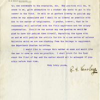 The Montana Agricultural Experiment Station Bozeman, Mont. Department of Entomology R.A. Cooley, Entomologist State Entomologist ty; one somewhere in the mountains, etc. The position will be, it seems to me, quite attractive to a student who wants to put in his summer in the field. He will be at perfect liberty to publish any notes he may accumulate and I shall be as liberal as possible with him in the matter of triplicates. I prefer, however, that he be reasonably well satisfied with the field experience and the salary compensation. Should he run across any new species we would be glad to have him publish them himself, depositing the types with us and we will publish the article for him in a new series of science bulletins which we are now starting from the College to supplement the Experiment Station bulletins. I would like to arrange this matter at one and would like the man to come as soon as possible. I shall start for the East about the first of May and the matter should all be arranged if possible before that time. Very truly yours, R.A. Cooley