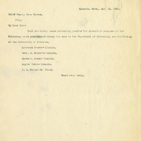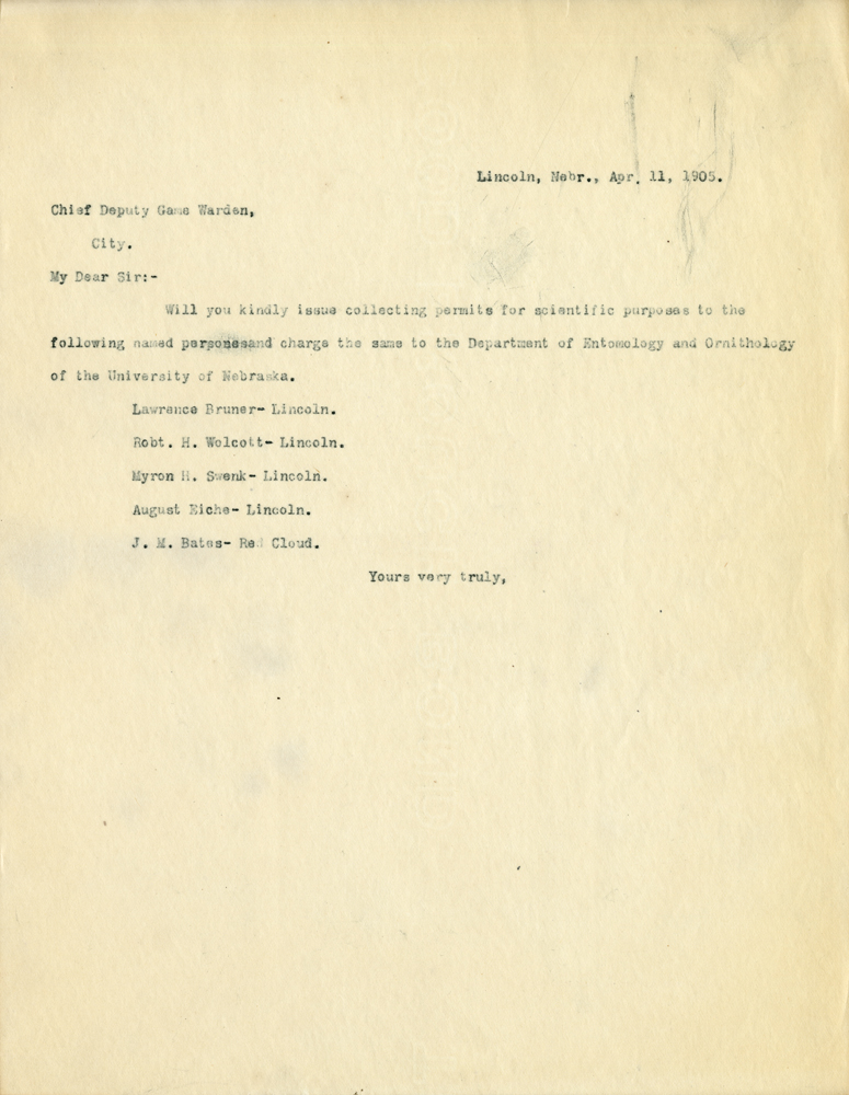 Lincoln, Nebr., Apr. 11, 1905. Chief Deputy Game Warden, City. My Dear Sir:- Will you kindly issue collecting permits for scientific purposes to the following named persons and charge the same to the Department of Entomology and Ornithology of the University of Nebraska. Lawrence Bruner-Lincoln. Robt. H. Wolcott- Lincoln. Myron H. Swenk- Lincoln. August Eiche- Lincoln. J. M. Bates- Red Cloud. Yours very truly,