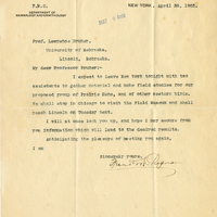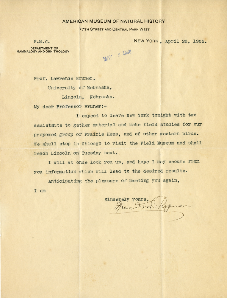 American Museum of Natural History 77th Street and Central Park West F. M. C. Department of Mammalogy and Ornithology New York, April 28, 1905. MAY 9 Ans'd Prof. Lawrence Bruner, University of Nebraska Lincoln, Nebraska. My dear Professor Bruner:- I expect to leave New York tonight with two assistants to gather material and make field studies for our proposed group of Prairie Hens, and of other western birds. We shall stop in Chicago to visit the Field Museum and shall reach Lincoln on Tuesday next. I will look you up, and hope I may secure from you information which will lead to the desired results. Anticipating the pleasure of meeting you again, I am Sincerely yours, Frans. M. Chapman
