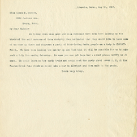 Lincoln, Nebr., May 16, 1905. Miss Agnes M. Dawson, 3510 Jackson Ave. Omaha, Nebr. My Dear Madam:- On Sunday when Miss Wood and Miss McDonald were down here looking up the birds of the salt marshes of this vicinity they intimated that they would like to have some of us come up there and chaperon a party of bird-loving Omaha people on a trip to Child's Point. We have been looking the matter up and find that it will be possible for us to make such a trip this coming Saturday. In case you can get together a crowd please notify us at once. We would leave on the early train and could meet the party about seven A. M. at the Paxton Hotel from which we could take a car to Albright and then walk in the woods. Yours very truly,
