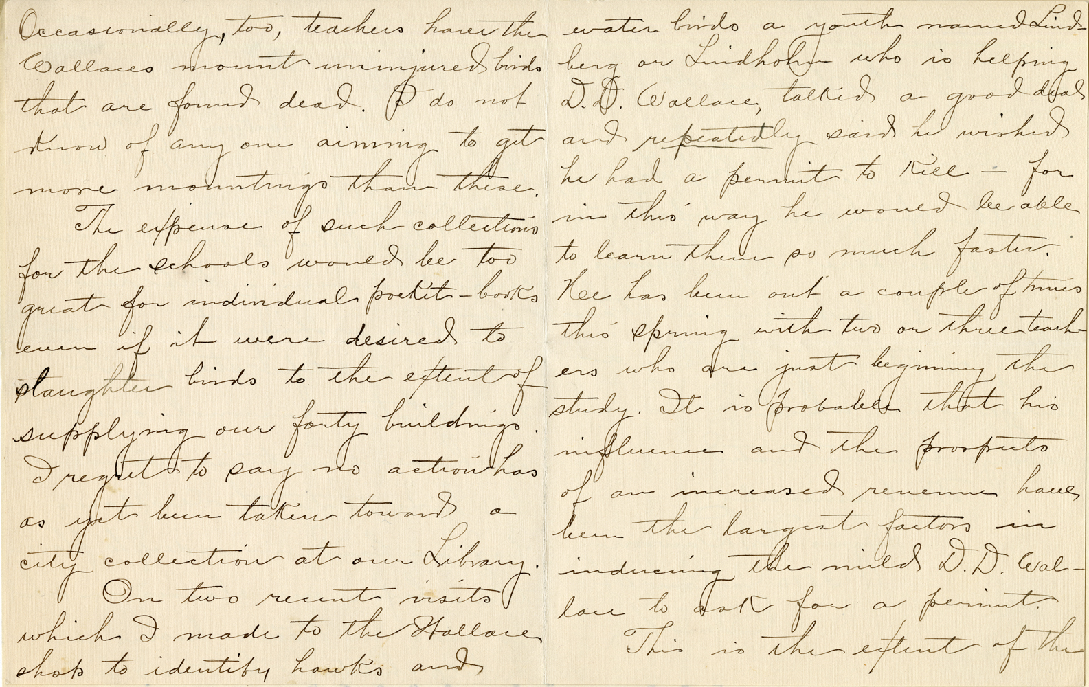 Occasionally, too teachers have the Wallaces mount uninjured birds that are found dead. I do not know of anyone aiming to get more mountings than these. The expense of such collections for the schools would be too great for the individual pocket-books even if it were desired to slaughter birds to the extent of supplying our forty buildings. I regret to say no action has as yet been taken toward a city collection at our Library. On two recent visits which I made to the Wallace shop to identify hawks and water birds a youth named Lindberg or Lindholm who is helping D. D. Wallace, talked a good deal and repeatedly said he wished he had a permit to kill—for in this way he would be able to learn them so much faster. He has been out a couple of times this spring with two or three teachers who are just beginning the study. It is probable that his influence and the prospects of an increased revenue have been the largest factor in inducing the mild D. D. Wallace to ask for a permit. This is the extent of the
