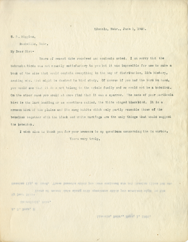 Lincoln, Nebr., June 1, 1905. S. B. Higgins, Rushville, Nebr. My Dear Sir:- Your of recent date received and contents noted. I am sorry that the Nebraska Birds was not exactly satisfactory to you but it was impossible for use to make a book of the size that would contain everything in the way of distribution, life history, nesting, etc. that might be desired in bird study. Of course if you had the bird in hand, you would see that it is does not belong to the oriole family and so could not be a bobolink. On the other hand you would at once find that it was a sparrow. The name of your particular bird is the lark bunting or as sometimes called, the White winged blackbird. It is a common bird of the plains and its song habits which only partly resemble those of the bobolink together with the black and white markings are the only things that would sugest the bobolink. I wish also to thank you for your answers to my questions concerning the Ox warbis. Yours very truly,