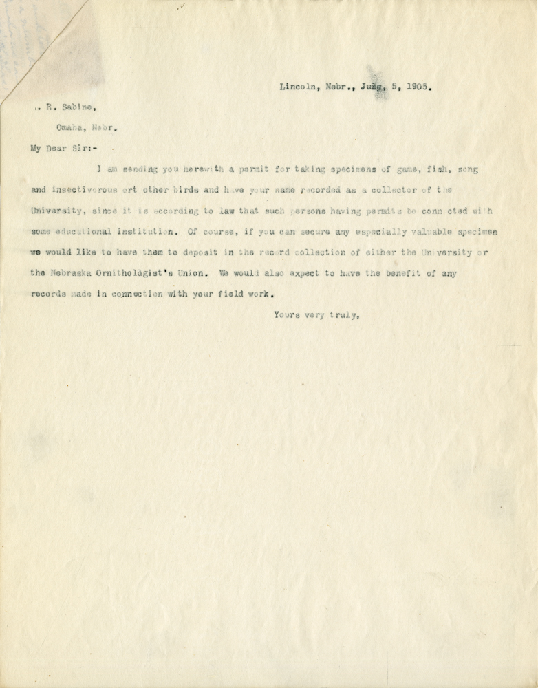 Lincoln, Nebr., June 5, 1905. R. Sabine, Omaha, Nebr. My Dear Sir:- I am sending you herewith a permit for taking specimens of game, fish, song and insectivorous or other birds and have your name recorded as a collector of the University, since it is according to law that such persons having permits be connected with some educational institution. Of course, if you can secure any especially valuable specimen we would like to have them to deposit in the record collection of either the University or the Nebraska Ornithologist's Union. We would also expect to have the benefit of any records made in connection with your field work. Yours very truly,