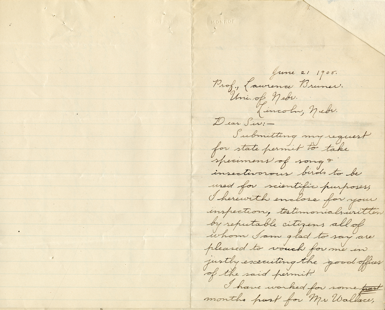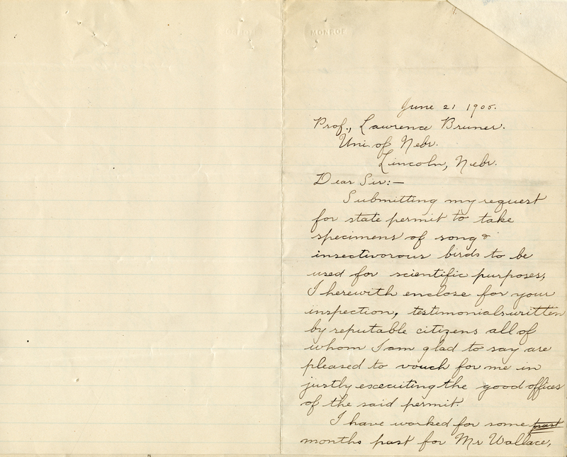 June 21 1905. Prof., Lawrence Bruner. Uni. of Nebr. Lincoln, Nebr. Dear Sir:- Submitting my request for state permit to take specimens of song & insectivorous birds to be used for scientific purposes. I herewith enclose for your inspection, testimonials written by reputable citizens all of whom I am glad to say are pleased to vouch for me in justly execuiting the good offices of the said permit. I have worked for some months past for Mr Wallace,