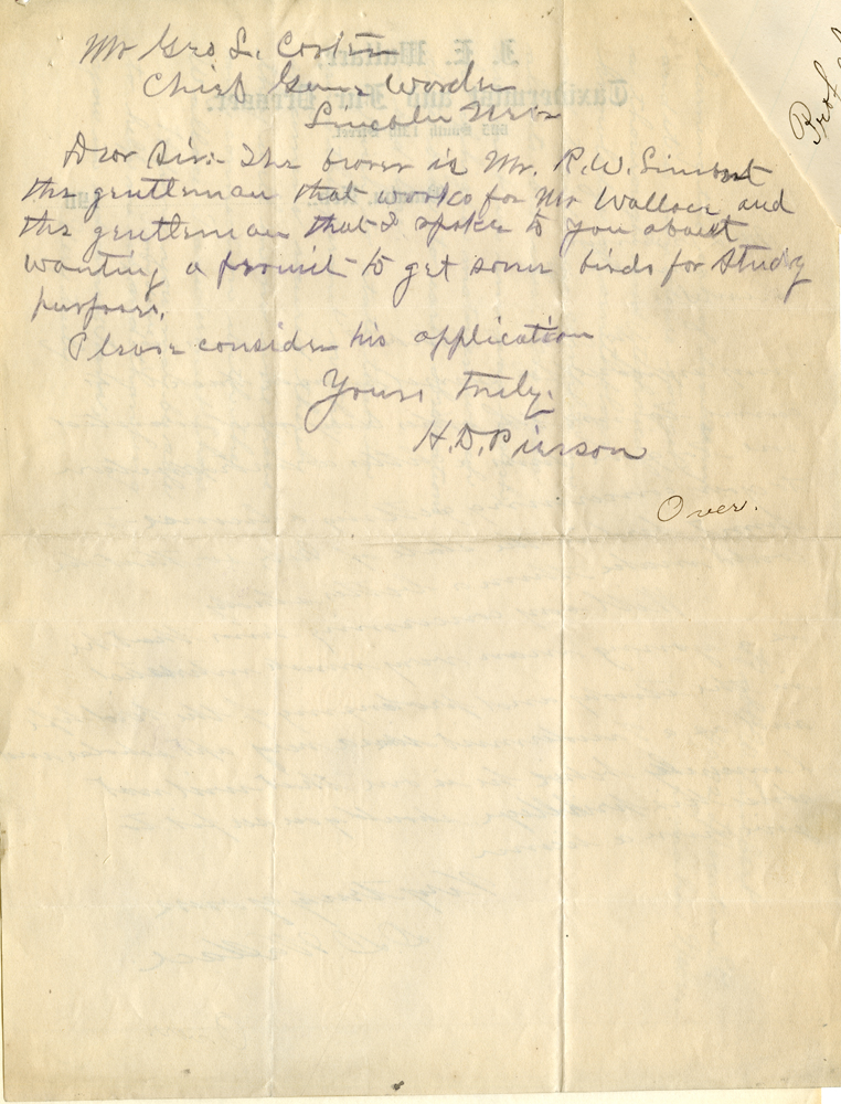 Mr. Geo. L. Carter Chief Game Warden Lincoln, Nebr. Dear Sir:-The [illegible] is Mr. R. W. Limbert the gentleman that works for Mr. Wallace and this gentleman that I spoke to you about wanting a permit to get some birds for study purposes. Please considers his application. Yours truly H. D. Pierson Over