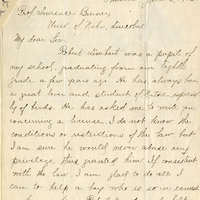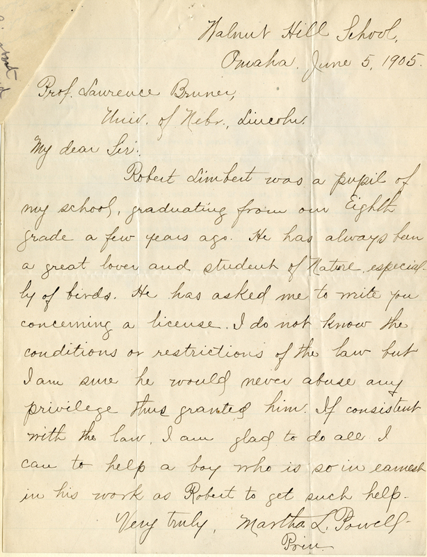 Walnut Hill School Omaha. June 5, 1905 Prof. Lawrence Bruner, Univ. of Nebr., Lincoln My dear Sir: Robert Limbert was a pupil of my school, graduating from our Eight grade a few years ago. He has always been a great lover and student of Nature, especially of birds. He has asked me to write you concerning a license. I do not know the conditions or restrictions of the law but I am sure he would never abuse any privilege thus granting him. If consistent with the law, I am glad to do all I can to help a boy who is so in earnest in his work as Robert to get such help. Very truly, Martha L. Powell Prin.