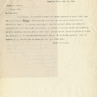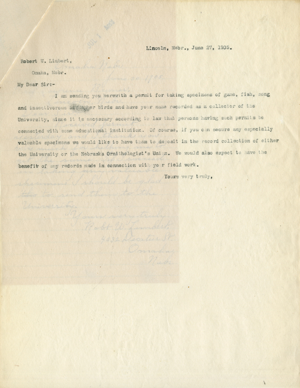 Lincoln, Nebr., June 27, 1905. Robert W. Limbert, Omaha, Nebr. My Dear Sir:- I am sending you herewith a permit for taking specimens of game, fish, song and insectivorous or other birds and have your name recorded as a collector of the University, since it is necessary according to law that such persons having such permits be connected with some educational institution. Of course, if you can secure any especially valuable specimens we would like to have them to deposit in the record collection of either the University or the Nebraska Ornithologist's Union. We would also expect to have the benefit of any records made in connection with your field work. Yours very truly,
