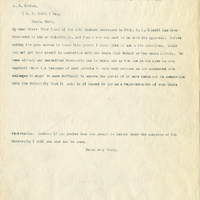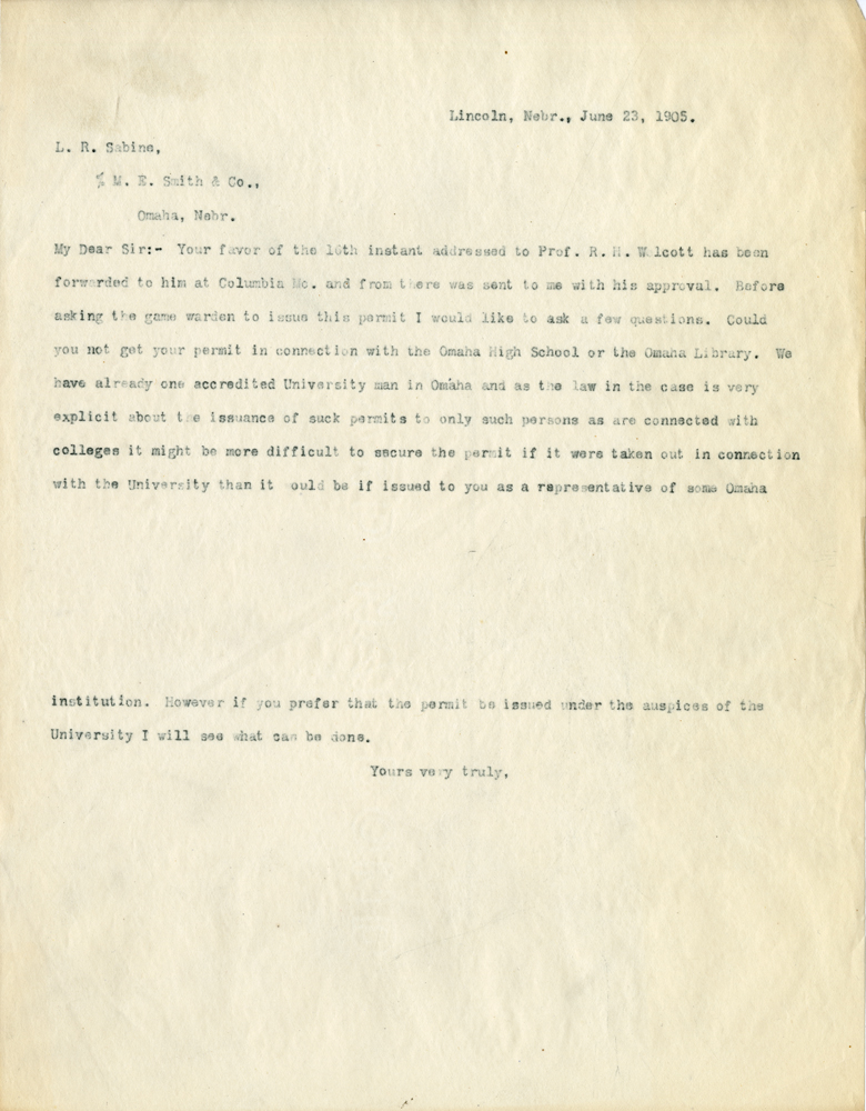 Lincoln, Nebr., June 23, 1905. L. R. Sabine, % M. E. Smith & Co., Omaha, Nebr. Dear Sir:- Your favor of the 10th instant addressed to Prof. R. H. Wolcott has been forwarded to him at Columbia Mo. and from there was sent to me with his approval. Before asking the game warden to issue this permit I wold like to ask a few questions. Could you not get your permit in connection with the Omaha High School or the Omaha Library. We have already one accredited University man in Omaha and as the law in the case is very explicit about the issuance of such permits to only such persons as are connected with colleges it might be more difficult to secure the permit if it were taken out in connection with the University than it would be if issued to you as a representative of some Omaha insitution. However if you prefer that the permit be issued under the auspices of the University I will see what can be done. Yours very truly.