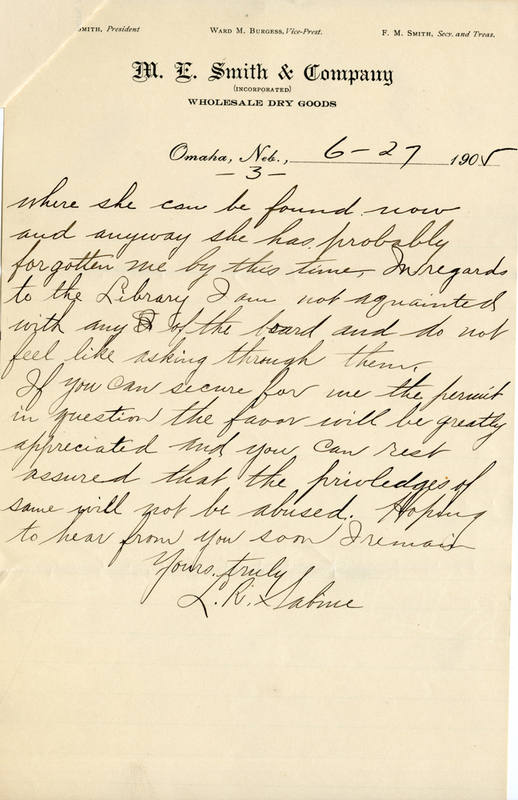 Arthur C. Smith, President Ward M. Burgess, Vice-Pres. F. M. Smith, Secr. and Treas. M. E. Smith & Company [Incorporated] Wholesale Dry Goods Omaha, Neb., 6-27 1905 where she can be found now and anyway she has probably forgotten me by this time. In regards to the Library I am not aquainted with any of the board and do not feel like asking through them. If you can secure for me the permit in question the favor will be greatly appreciated and you can rest assured that the privledges of same will not be abused. Hoping to hear from you soon I remain Yours truly L. R. Sabine