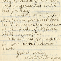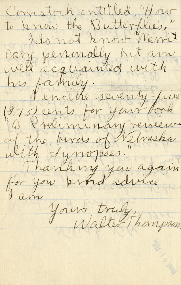 Comstock entitled, "How to know the Butterflies." I do not know Merrit Cary personally but am well acquainted with his family. I enclose seventy-five ($.75) cents for your book "A Preliminary review of the birds of Nebraska with Synopses." Thanking you again for you kind advice I am Yours truly, Walter Thompson.