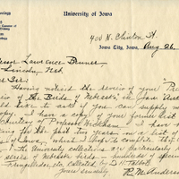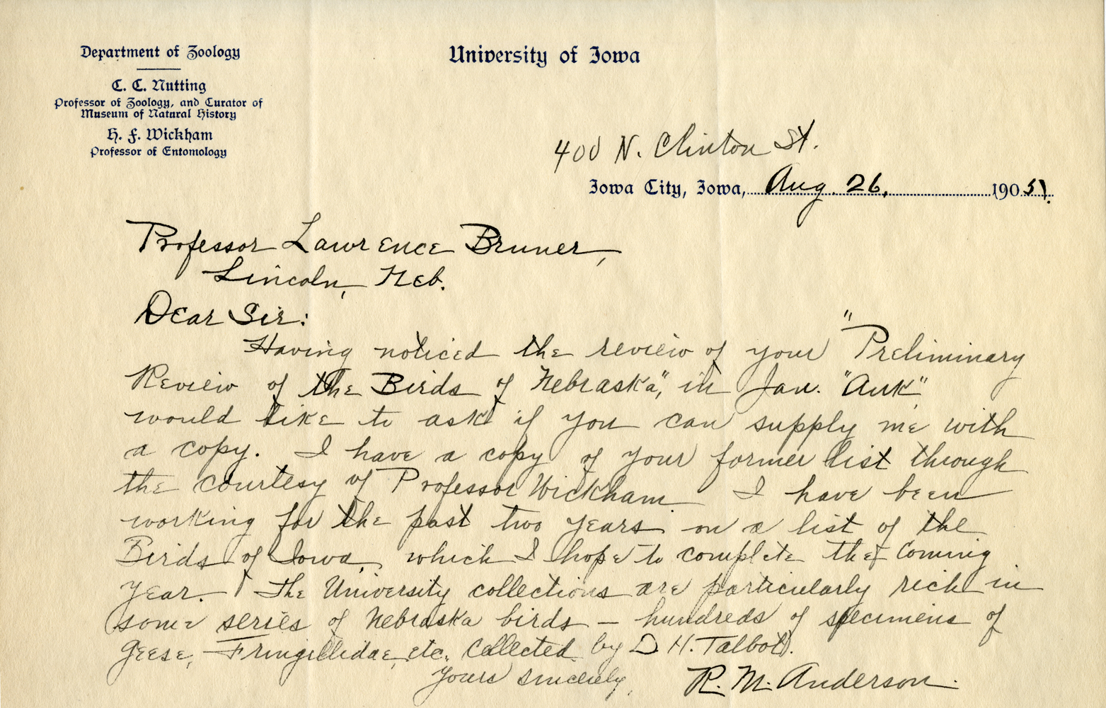 University of Iowa Department of Zoology C. C. Nutting Professor of Zoology, and Curator of Museum of Natural History H. F. Wickham Professor of Entomology 400 N. Clinton Iowa City, Iowa, Aug 26, 1905. Professor Lawrence Bruner, Lincoln, Neb. Dear Sir: Having noticed the review of your "Preliminary Review of the Birds of Nebraska," in Jan. "Auk" would like to ask if you can supply me with a copy. I have a copy of your former list throught he courtesy of Professor Wickham. I have been working for the past two years on a list of the Birds of Iowa, which I hope to complete the coming year. The University collections are particularly rich in your series of Nebraska birds—hundreds of specimens of Geese, Fringillidae, etc. collected by D. H. Talbot. Yours sincerely, R. M. Anderson.