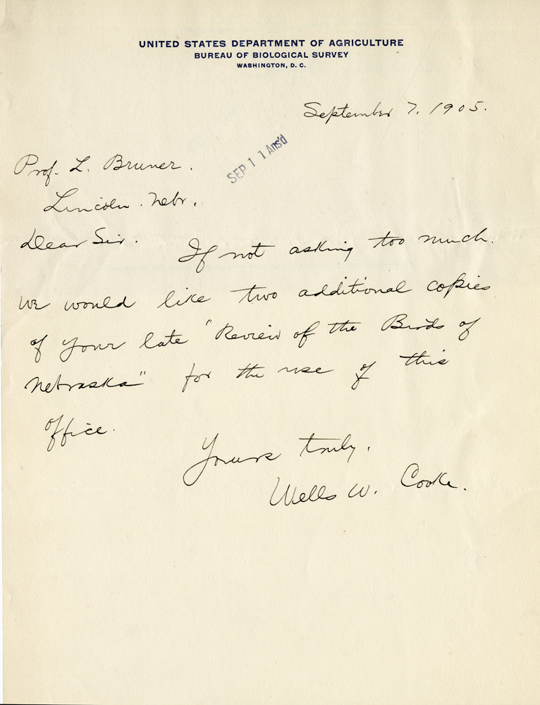 United States Department of Agriculture Bureau of Biological Survey Washington, D. C. September 7, 1905. Prof. L. Bruner Lincoln, Nebr. Dear Sir. If not asking too much we would like two additional copies of your late "Review of the Birds of Nebraska" for the use of this office. Yours truly, Wells W. Cooke.