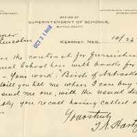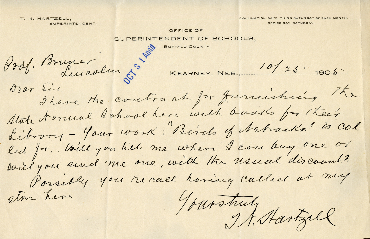 T. N. Hartzell, Superintendent. Examination Days, Third Saturday of Each Month. Office Day, Saturday. Office of Superintendent of Schools, Buffalo County. Prof. Bruner Lincoln OCT 31 Ans'd Kearney, Neb., 10/25 1905 Dear Sir: I have the contract for furnishing the State Normal School here with books for their Library. Your work: "Birds of Nebraska" is called for. Will you tell me where I can buy one or will you send me one, with the usual discount. Possibly you recall having called at my store here. Yours truly T. N. Hartzell