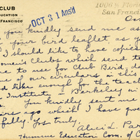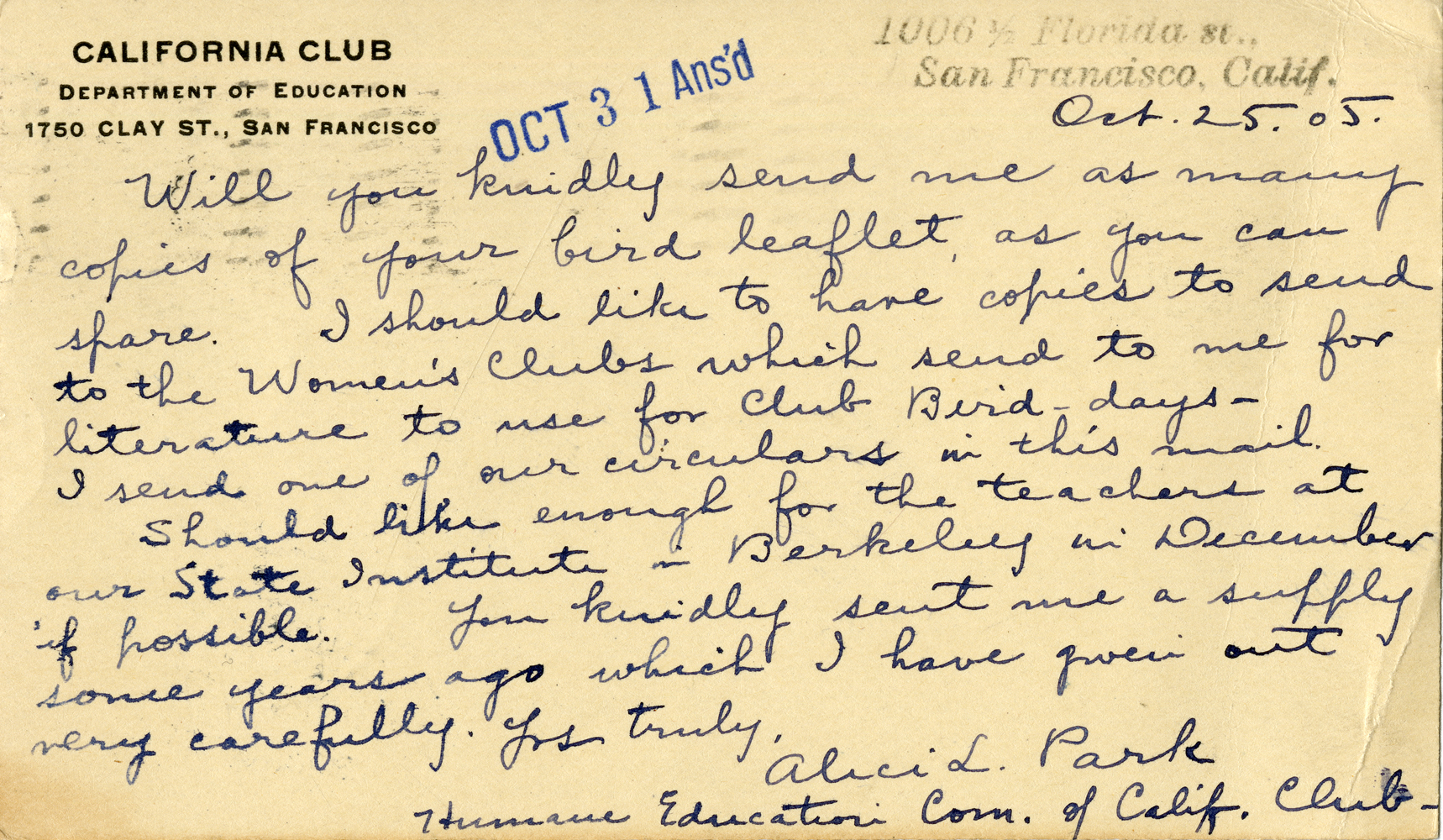 California Clujb Department of Education 1750 Clay St., San Francisco 1006 Florida St. San Francisco, Calif. Oct. 25. 05. OCT 31 Ans'd Will you kindly send me as many copies of your bird leaflet as you can spare. I should like to have copies to send to the Women's Clubs which send to me for literature to use for Club bird days. I send one of our circulars in this mail. Should like enough for the teachers at our State Institute in Berkeley in December if possible. You kindly sent me a supply some years ago which I have given out very carefully. Yrs. truly, Alice L. Park Humane Education Com. of Calif. Club.
