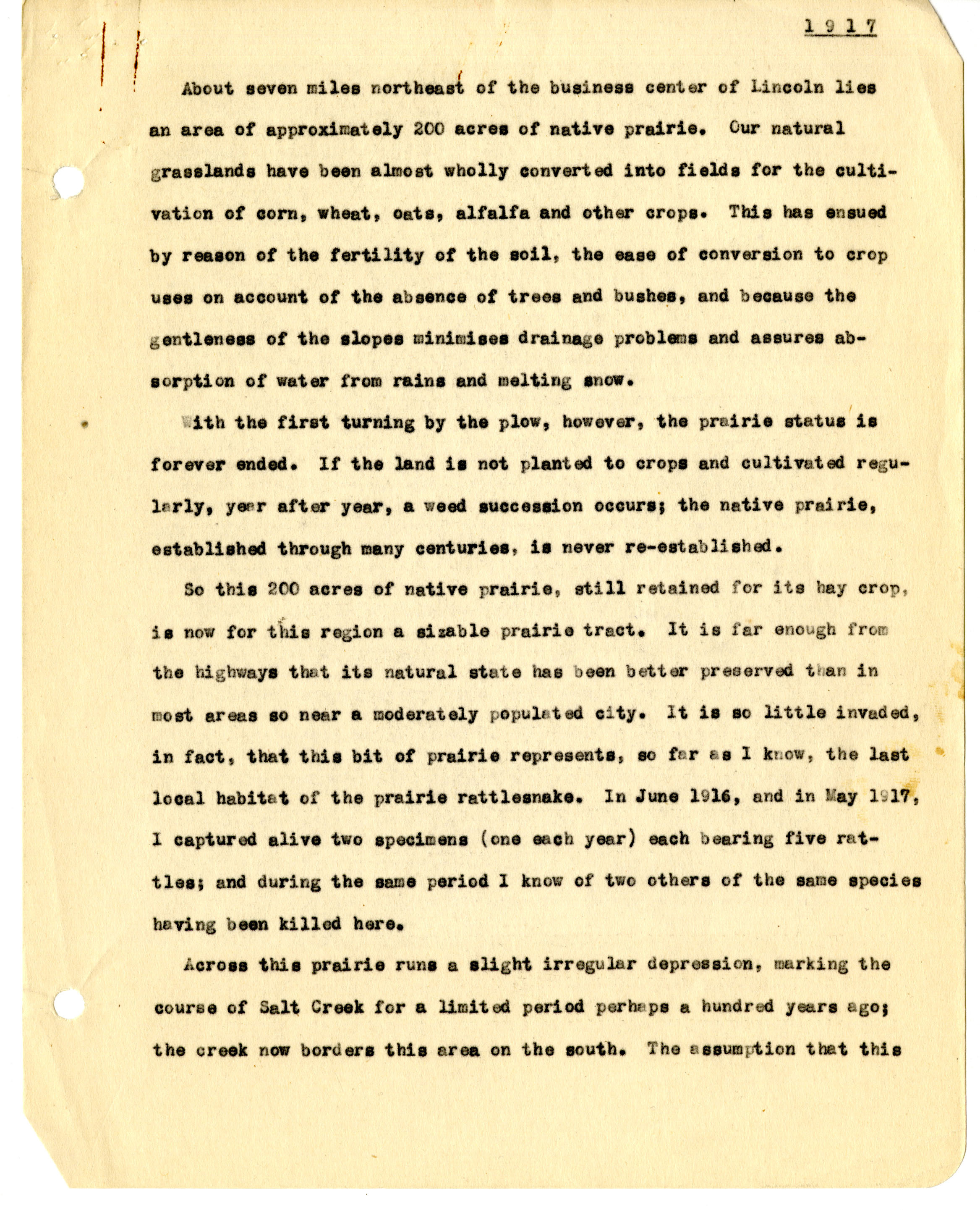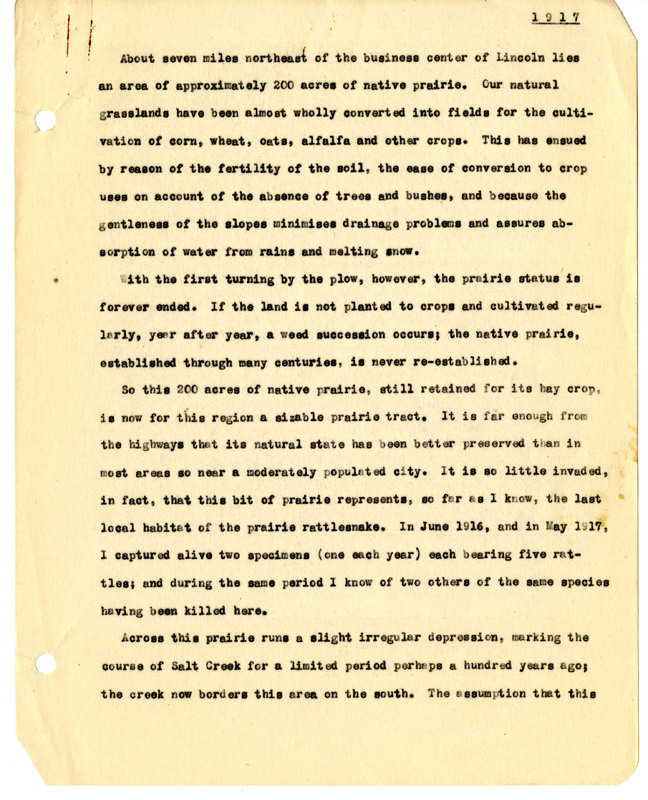 Frank H. Shoemaker typescript, 6 pages, detailing the native prairie 7 miles from Lincoln, Nebraska