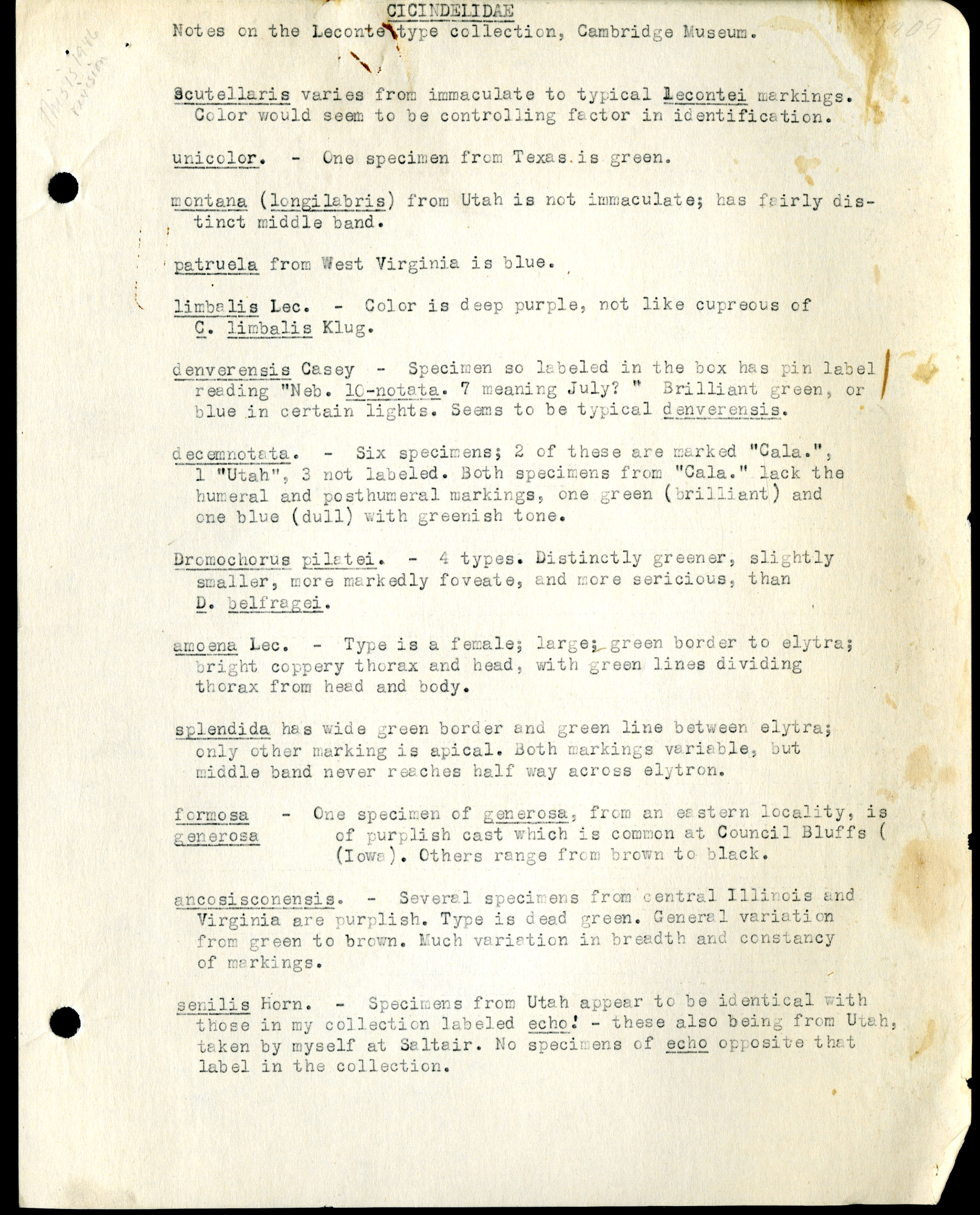 Frank H. Shoemaker typescript, 31 pages, including notes and list on CICINDELIDAE in the Carnegie Museum, Pittsburgh, PN, Nebraska, and his own collection.