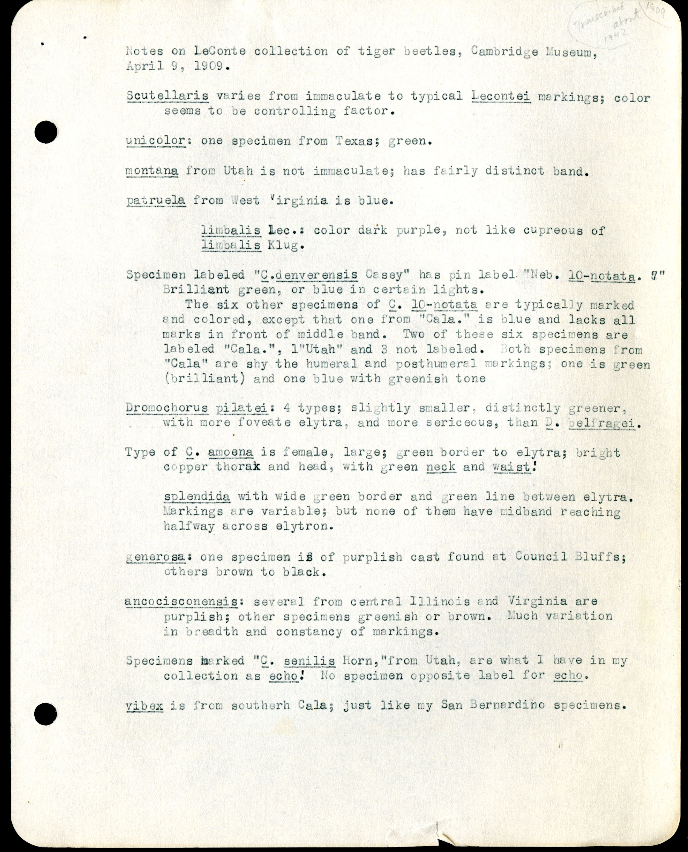 Frank H. Shoemaker typescript, 31 pages, including notes and list on CICINDELIDAE in the Carnegie Museum, Pittsburgh, PN, Nebraska, and his own collection.