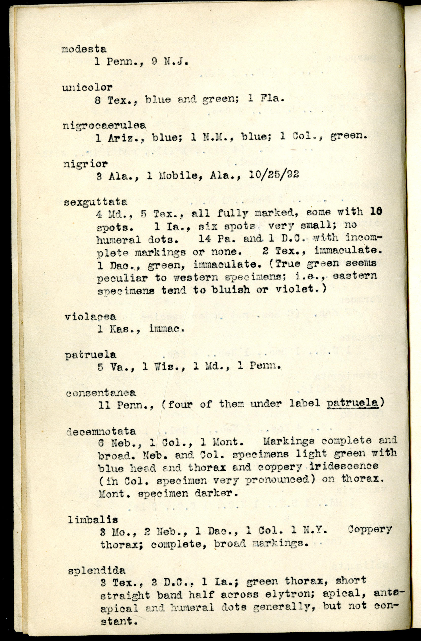 Frank H. Shoemaker typescript, 31 pages, including notes and list on CICINDELIDAE in the Carnegie Museum, Pittsburgh, PN, Nebraska, and his own collection.