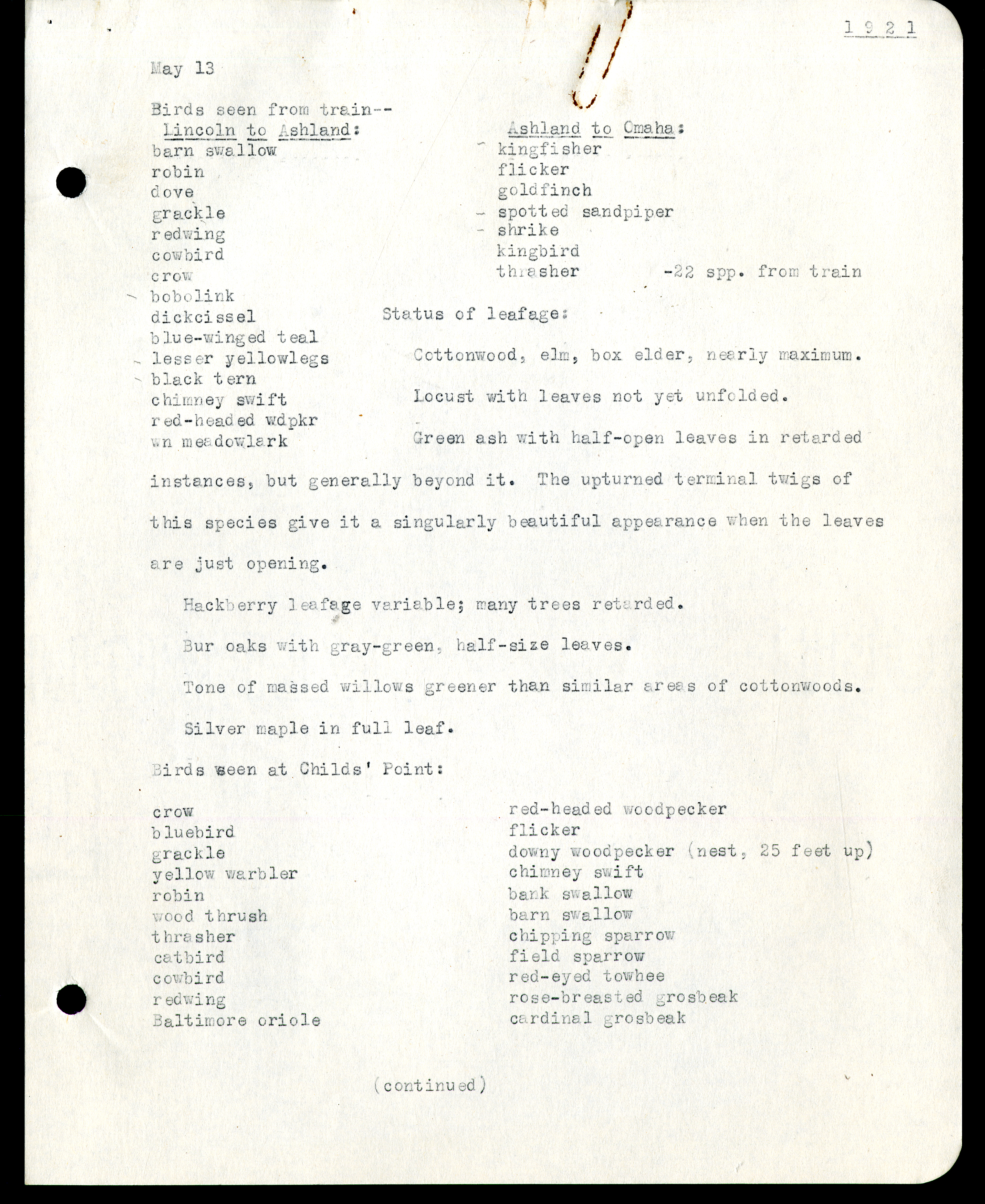 Frank H. Shoemaker typescript, 2 pages, list of birds seen from train, Lincoln, Omaha, Nebraska.