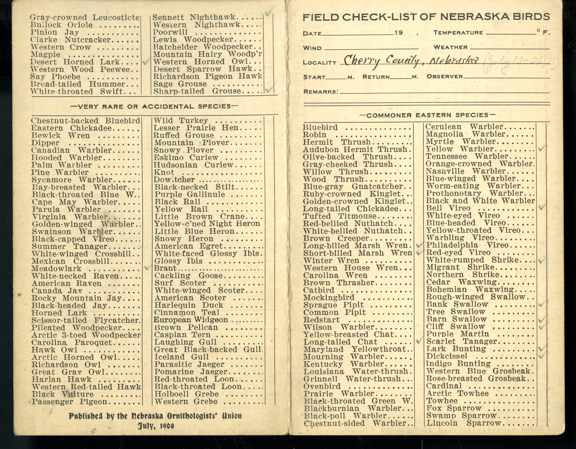 Frank H. Shoemaker bird record, sited on July 13-26, 1911, in Cherry County, Nebraska, and recorded on the "Field Check List of Nebraska Birds."