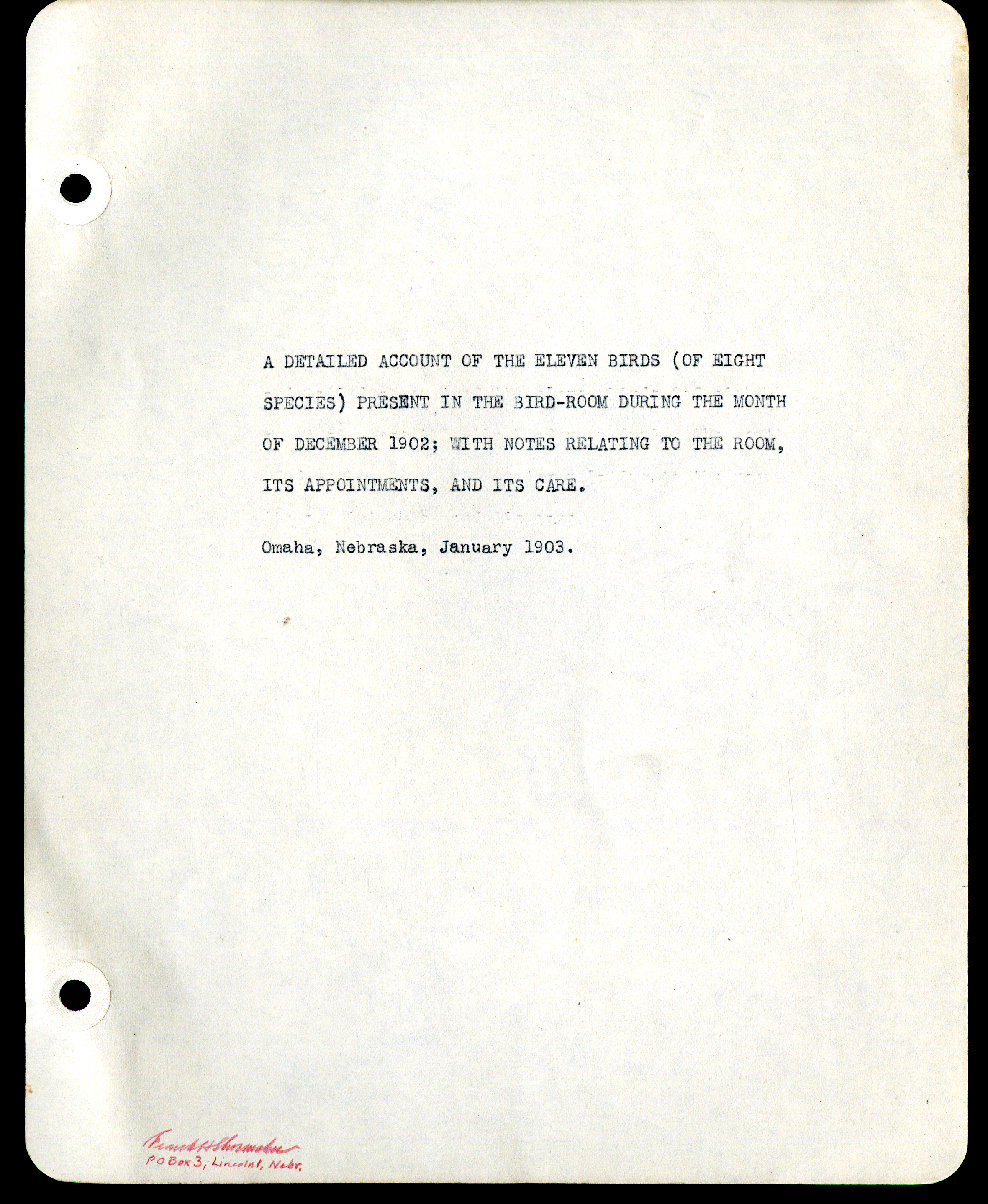 Frank H. Shoemaker typescript narrative, 29 pages, on the bird room in Omaha home, with details on bird and insects.