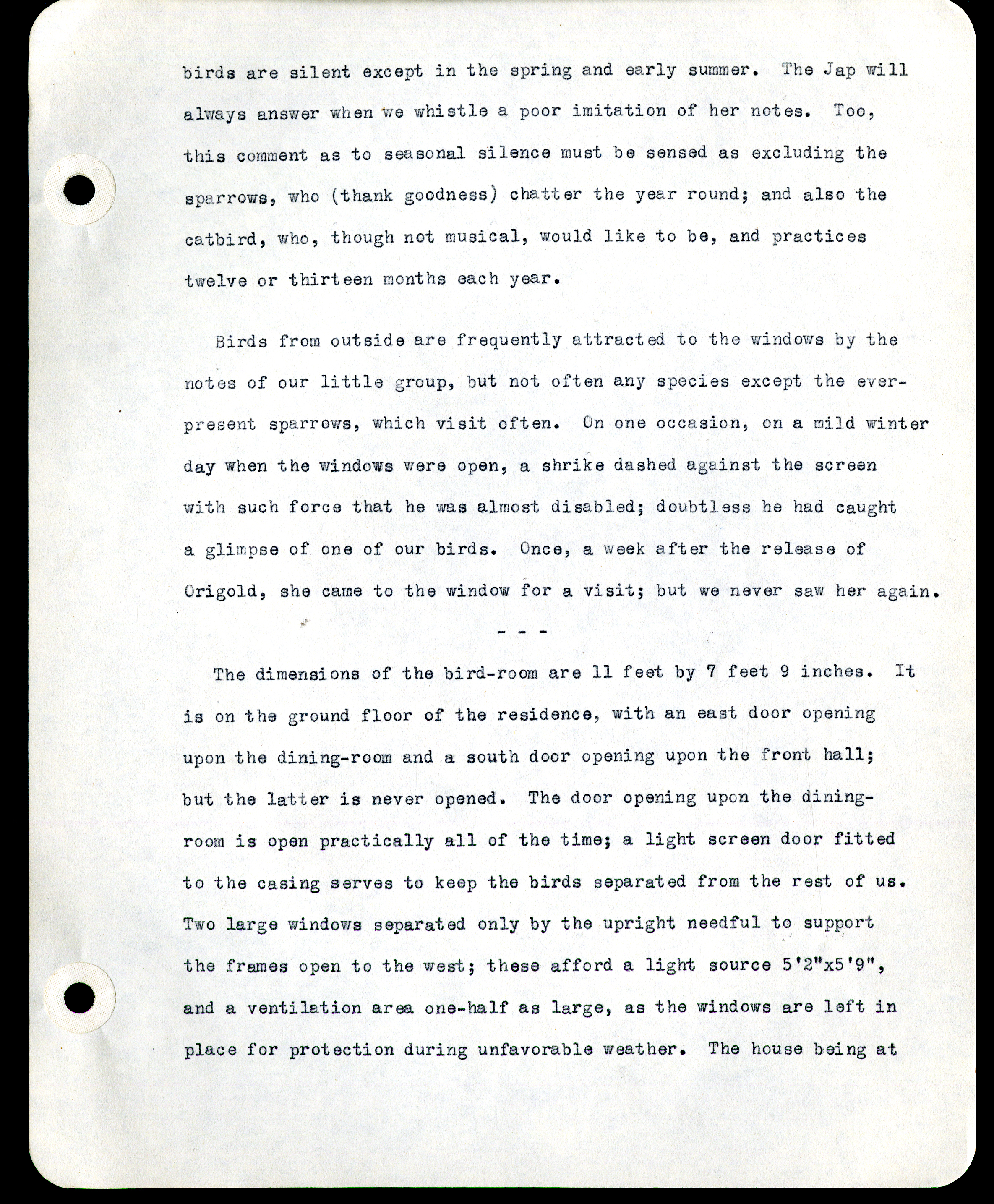 Frank H. Shoemaker typescript narrative, 29 pages, on the bird room in Omaha home, with details on bird and insects.