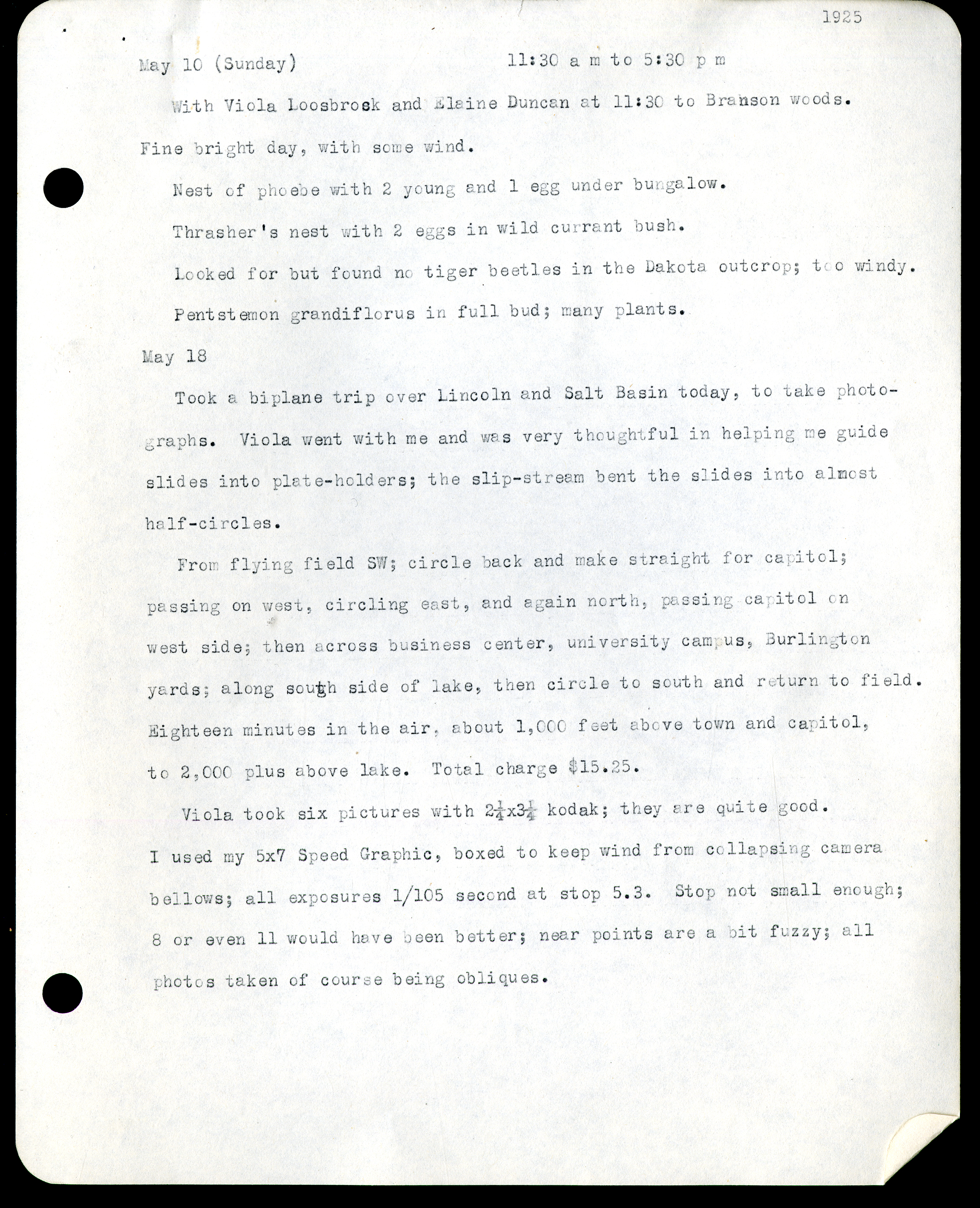 Frank H. Shoemaker typescript, 3 pages, on Woodlawn Cemetary and Branson Woods, including biplane trip over Lincoln, Nebraska.