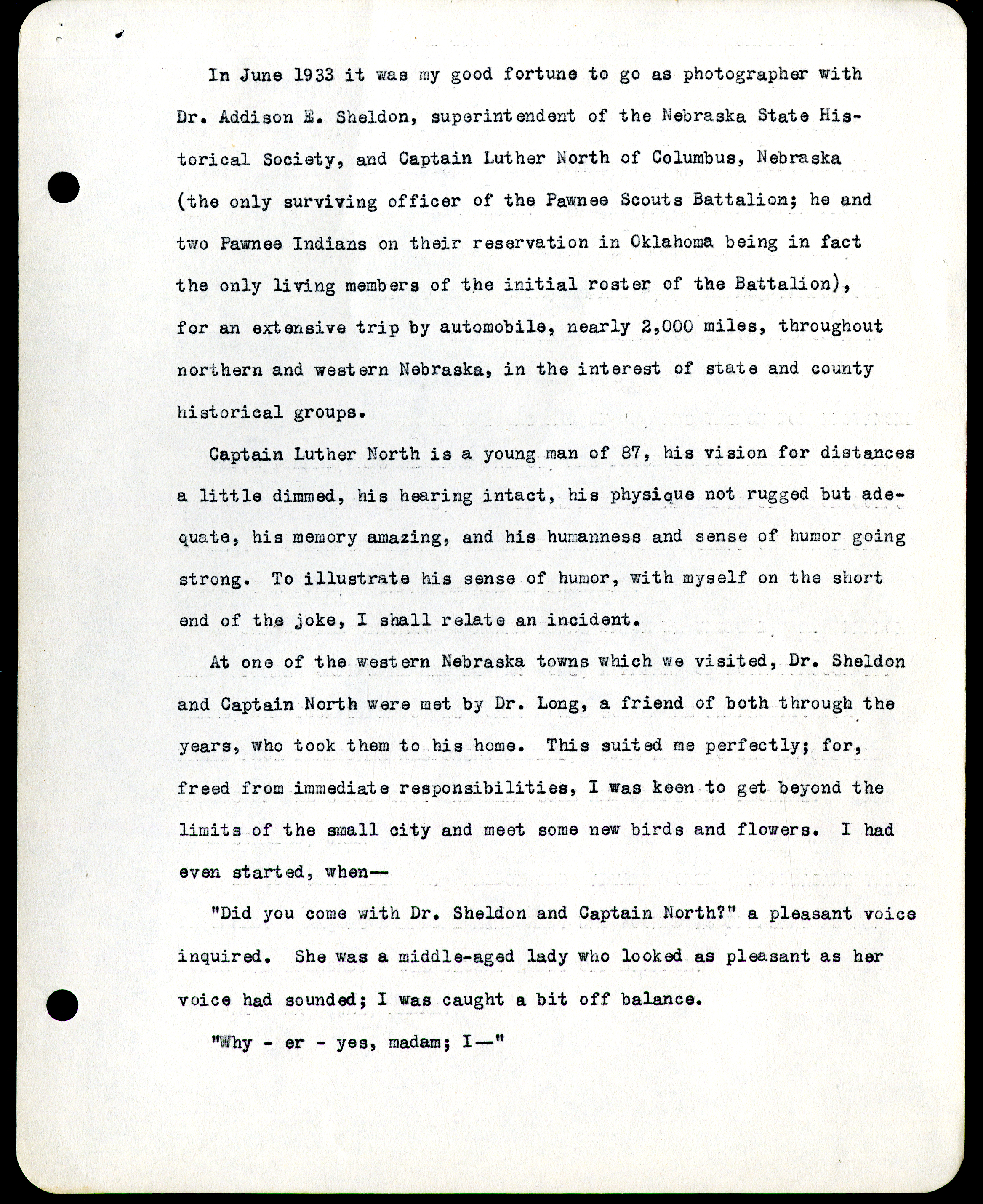Frank H. Shoemaker typescript, 4 pages, on trip as photographer with Addison E. Sheldon, along with notes from Captain Luthor North's travel diary.