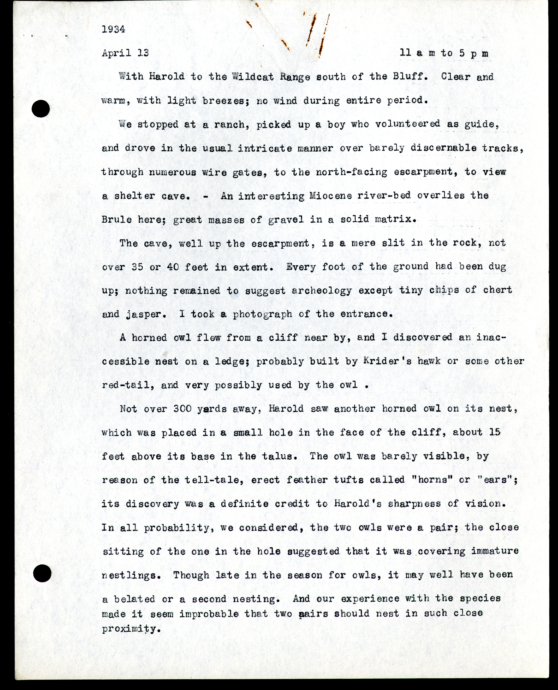 Frank H. Shoemaker typescript, 9 pages, on Wildcat Range and owls, fossils, and lantern slides.