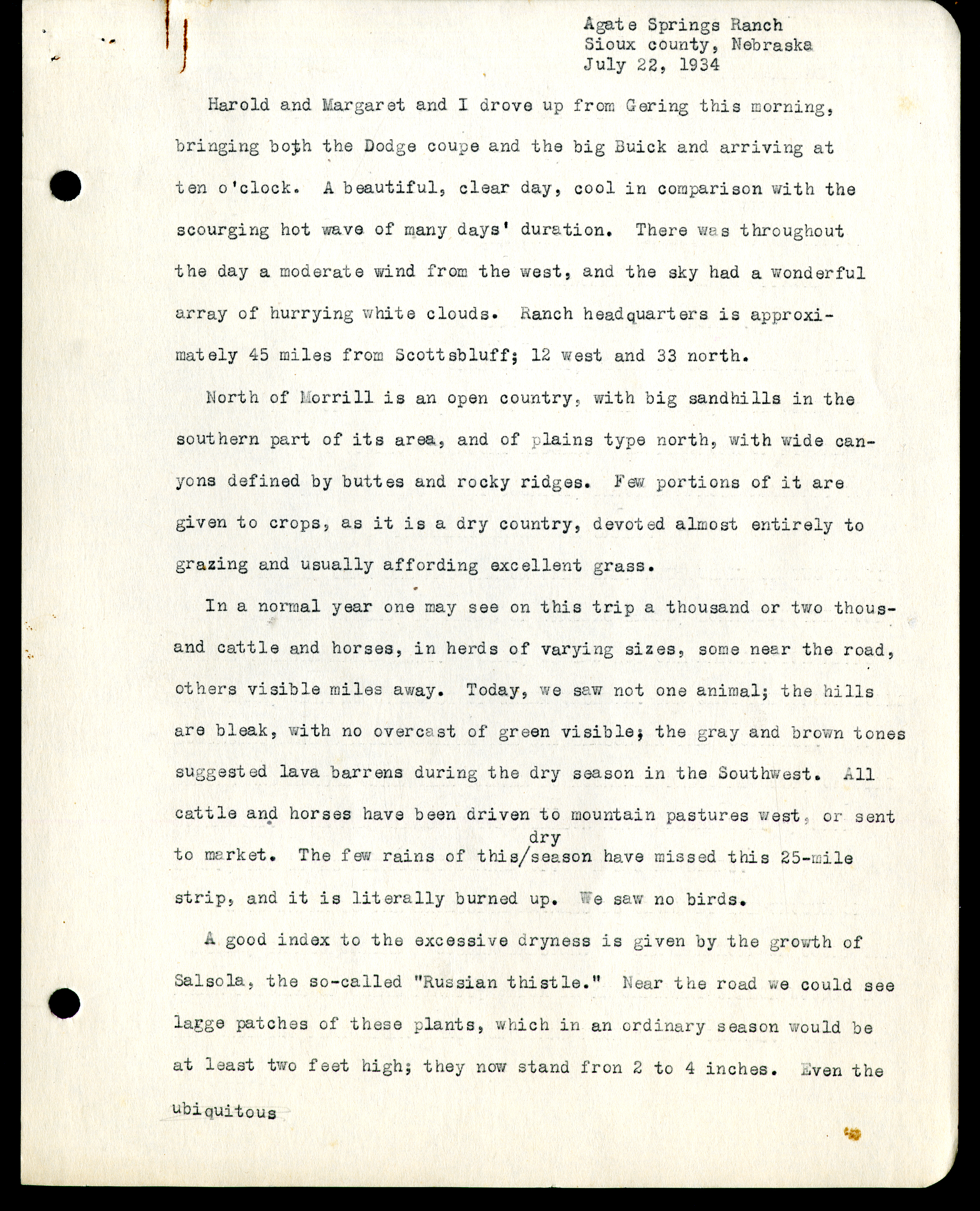 Frank H. Shoemaker typescript, 8 pages, on trip to Agate Springs Ranch with bird list.