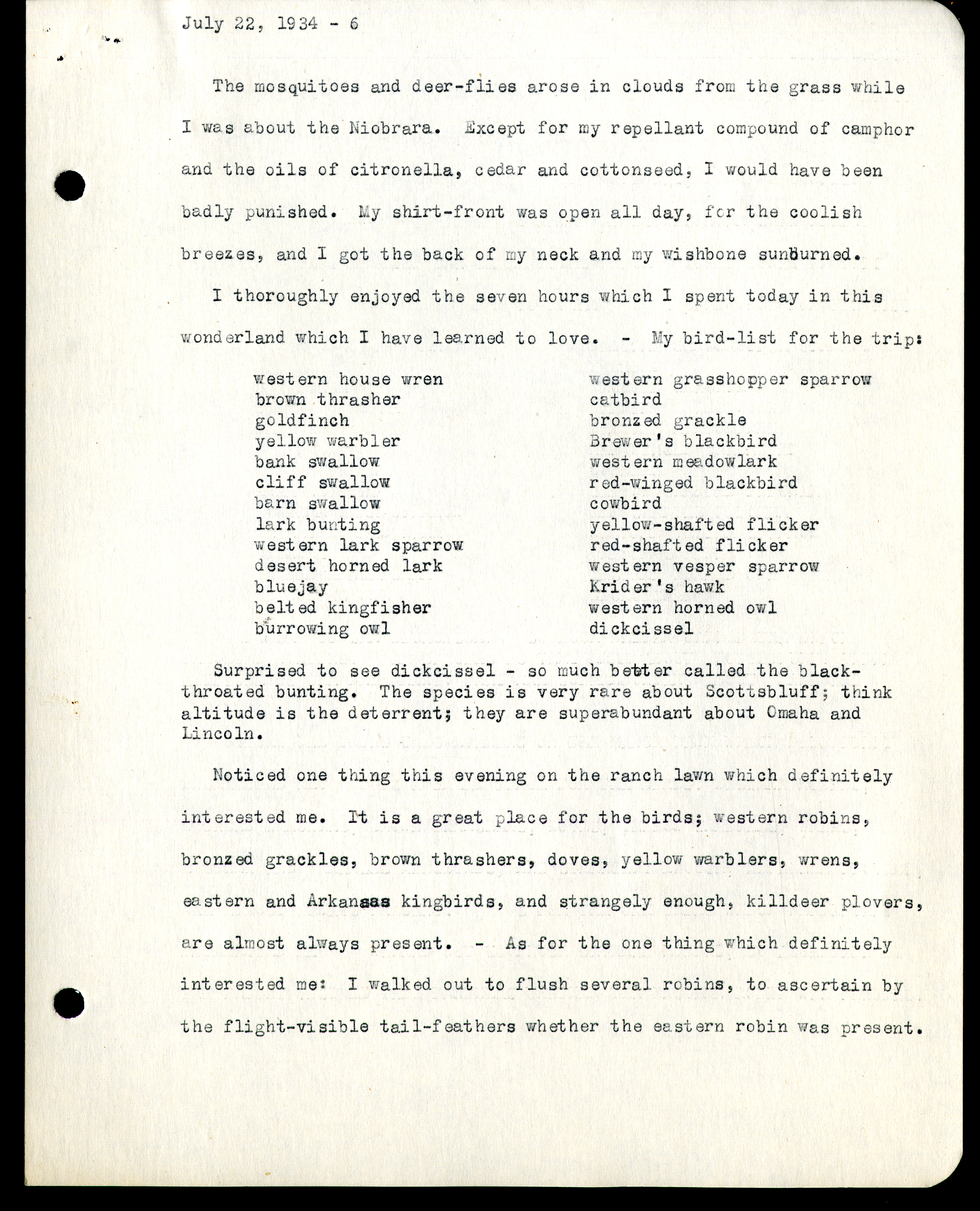 Frank H. Shoemaker typescript, 8 pages, on trip to Agate Springs Ranch with bird list.