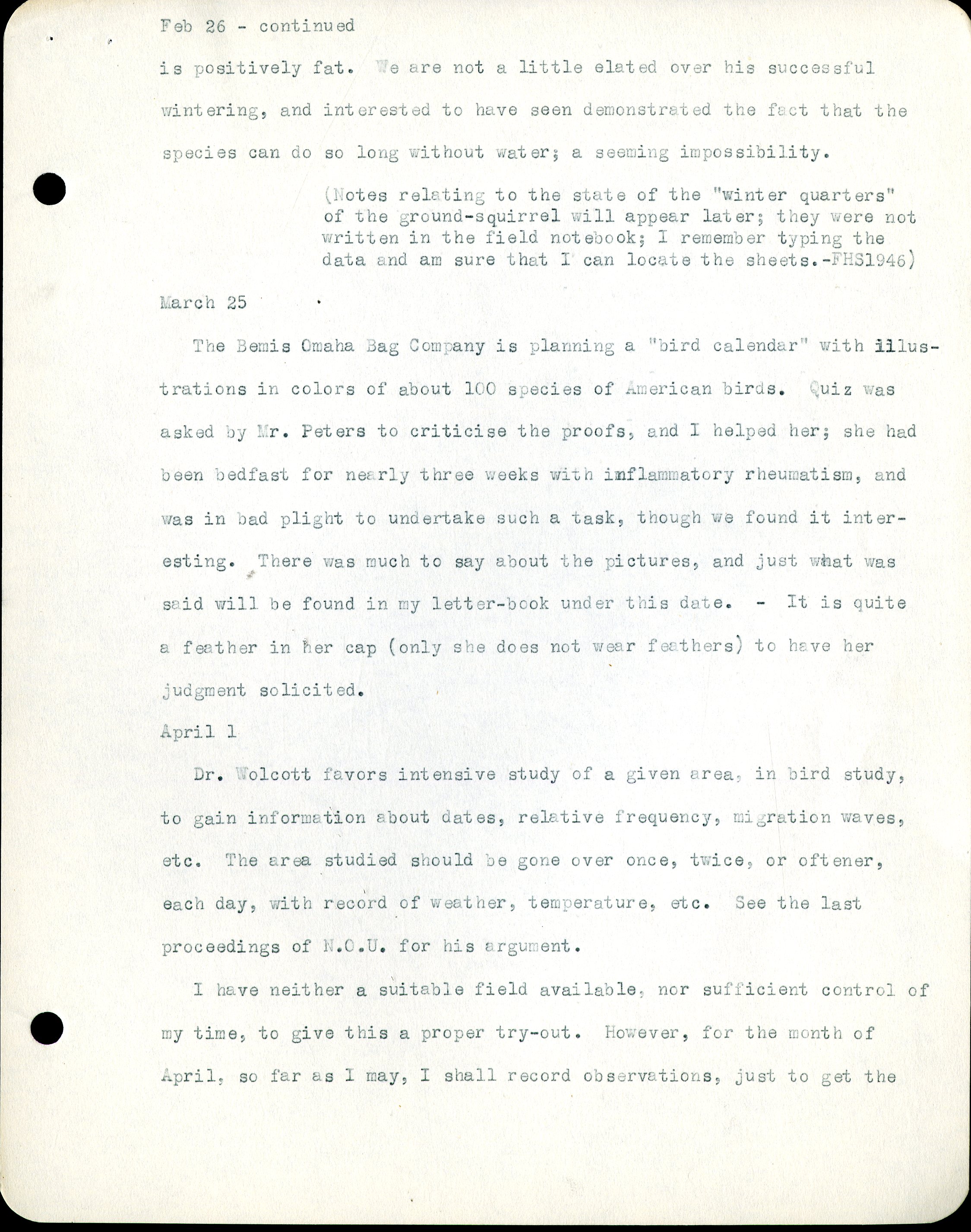 Frank H. Shoemaker typescript, 11 pages, on birds living in bird room in Omaha home with a list of birds in general Omaha region.