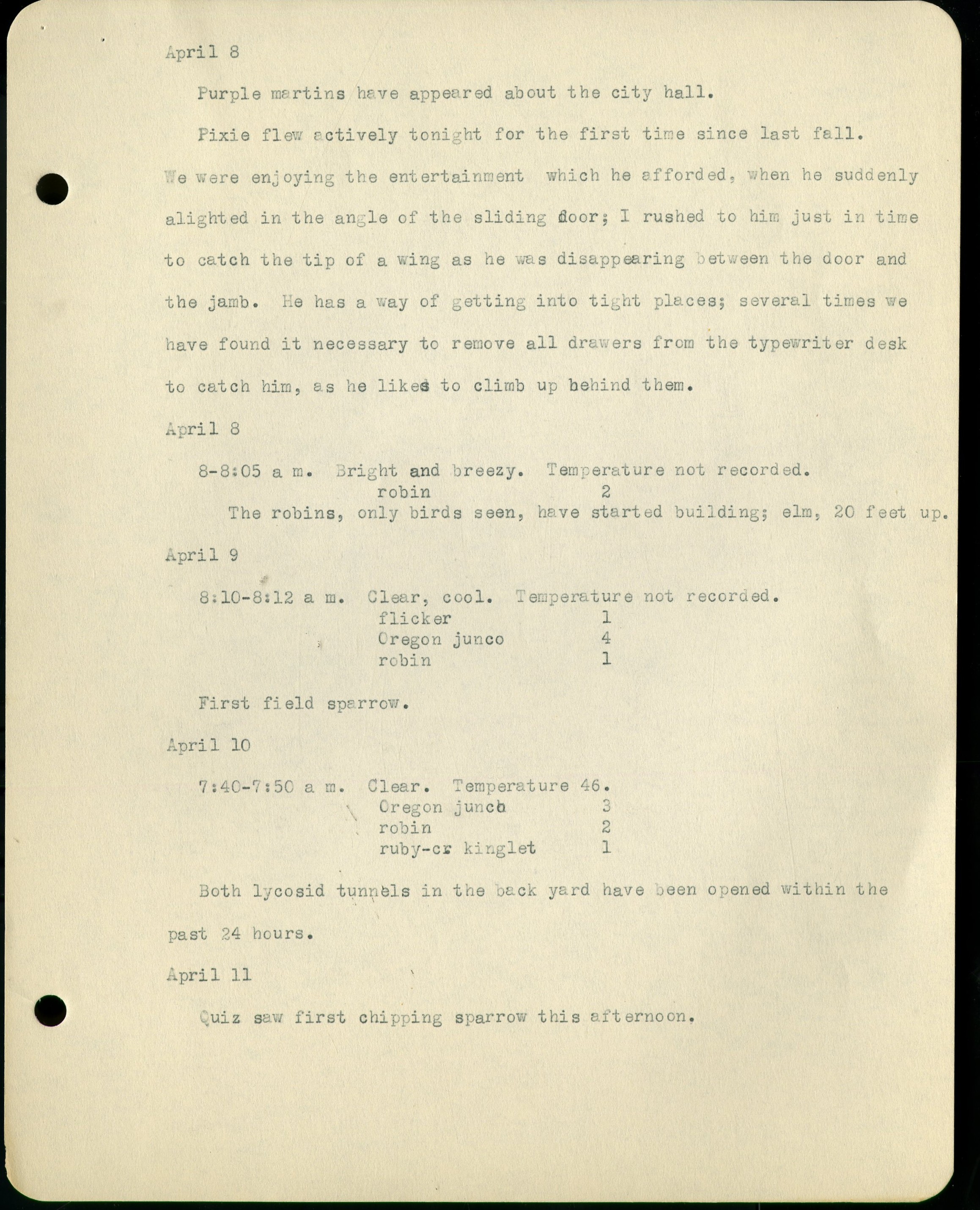 Frank H. Shoemaker typescript, 11 pages, on birds living in bird room in Omaha home with a list of birds in general Omaha region.