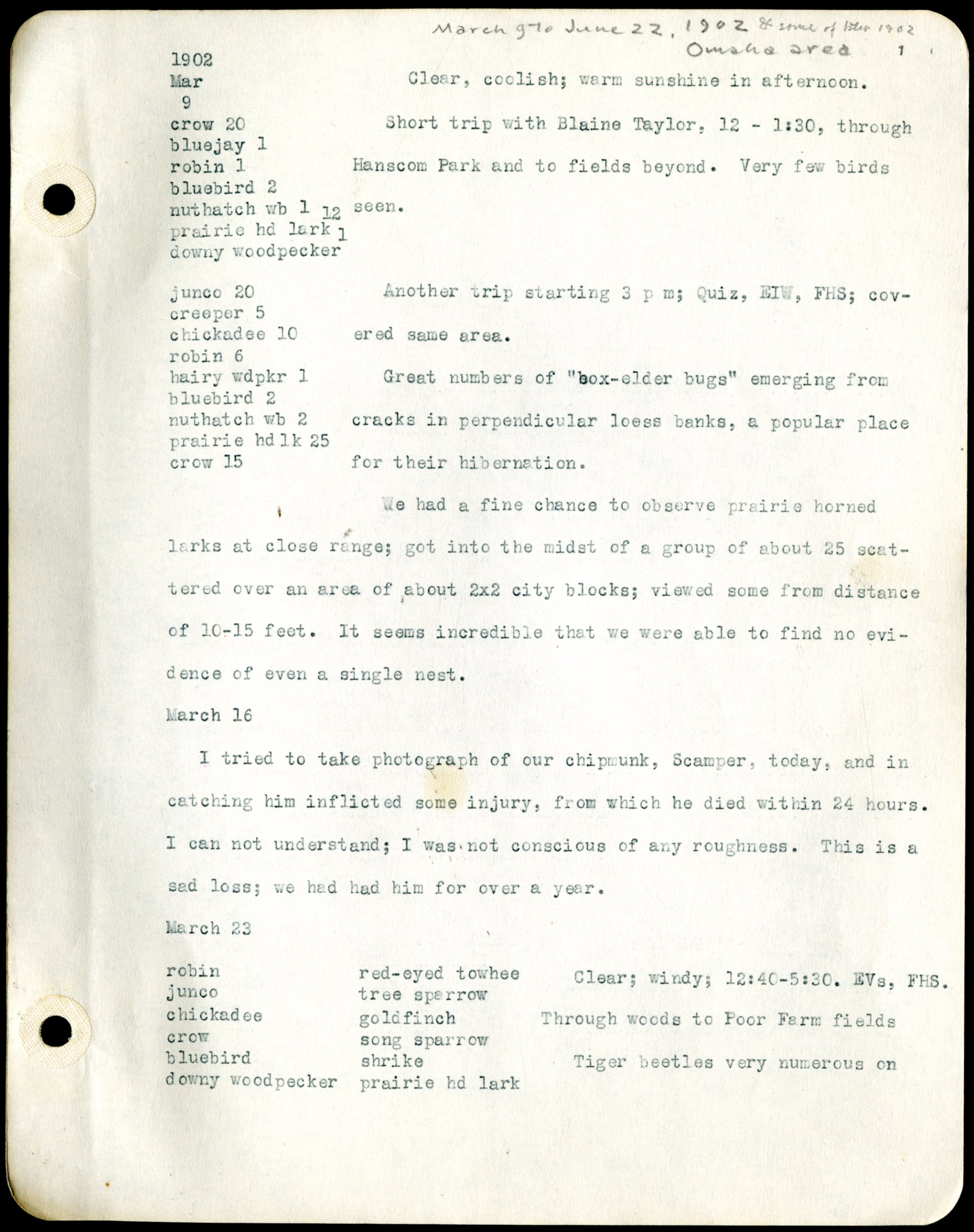 Frank H. Shoemaker typescript, 46 pages, detailing bird sightings, field trips, photography, and associated activities in Omaha, Nebraska.