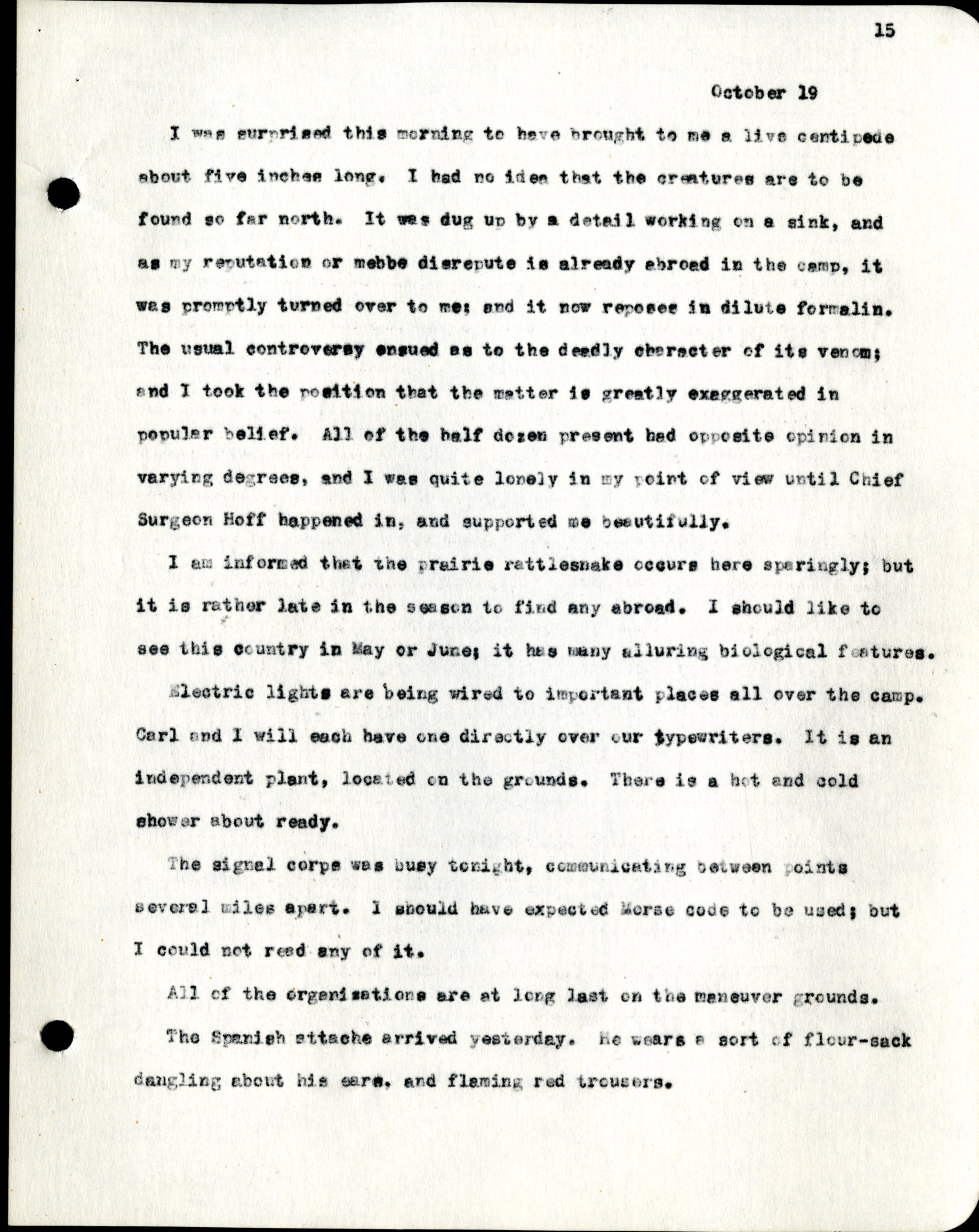 Frank H. Shoemaker typescript, 28 pages, titled "At Fort Riley, Kansas" on activities at Fort Riley between Oct. 12-29, 1903.
