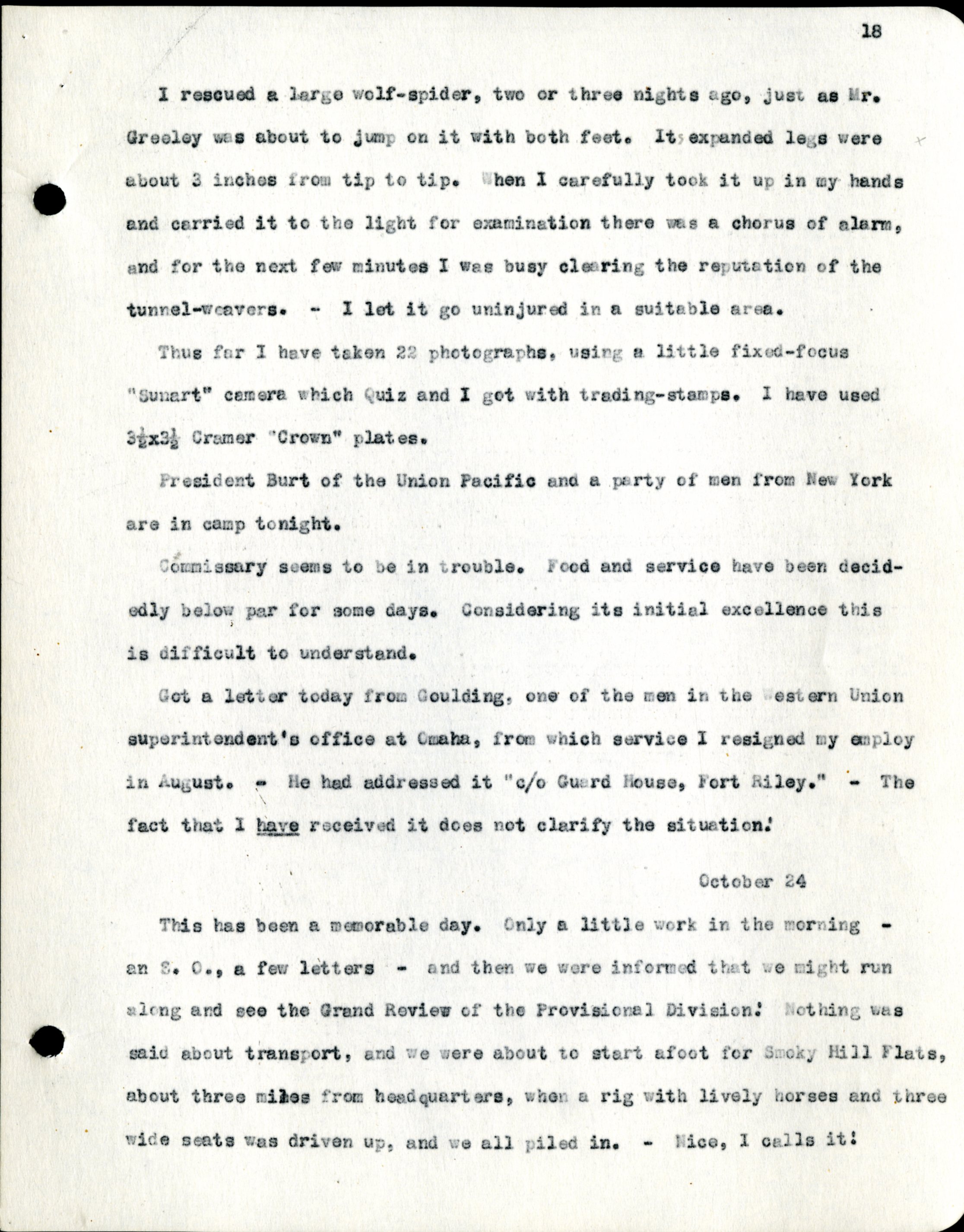 Frank H. Shoemaker typescript, 28 pages, titled "At Fort Riley, Kansas" on activities at Fort Riley between Oct. 12-29, 1903.
