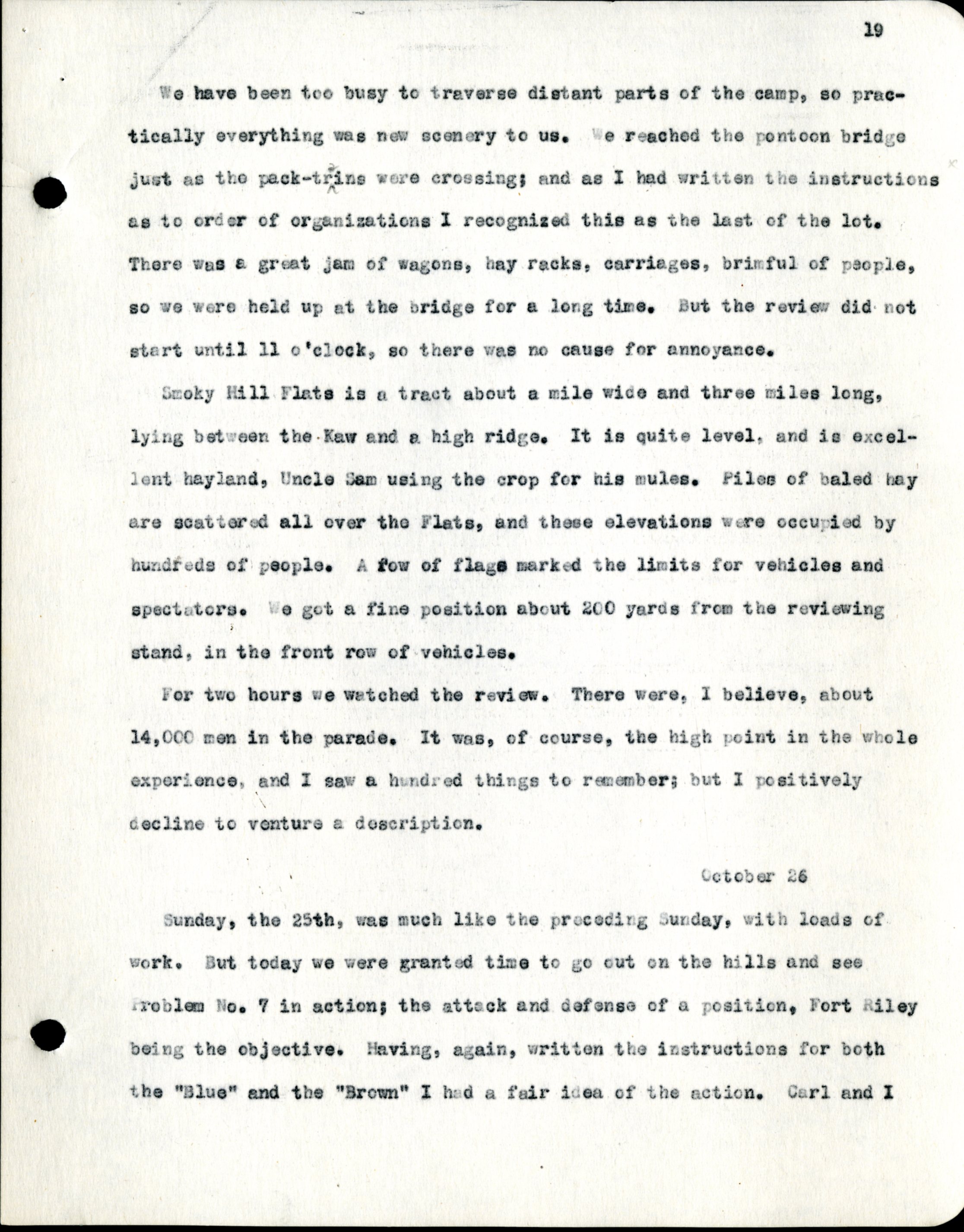 Frank H. Shoemaker typescript, 28 pages, titled "At Fort Riley, Kansas" on activities at Fort Riley between Oct. 12-29, 1903.