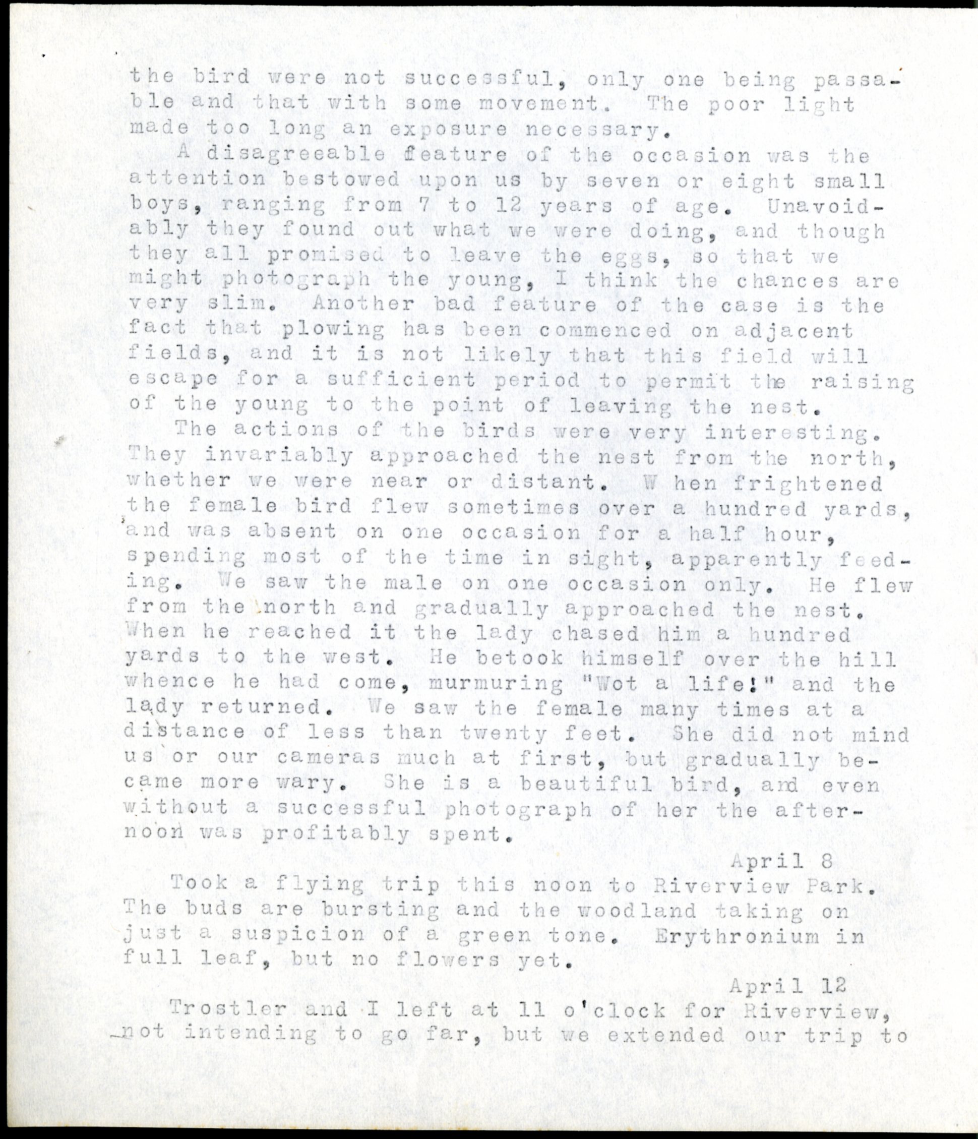 Frank H. Shoemaker typescript, 20 pages, detailing bird sightings, field trips, photography, and associated activities in Omaha, Nebraska.