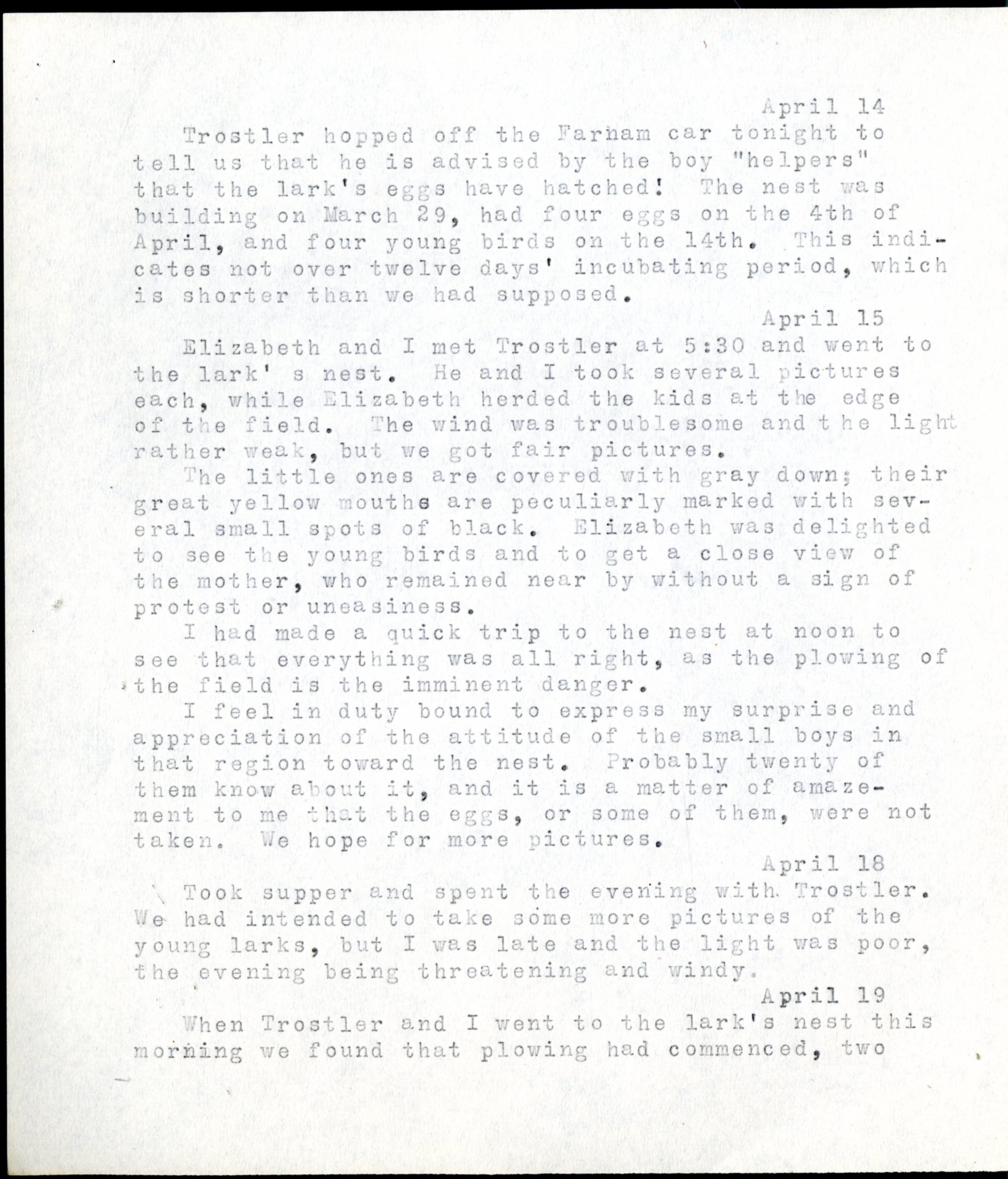 Frank H. Shoemaker typescript, 20 pages, detailing bird sightings, field trips, photography, and associated activities in Omaha, Nebraska.