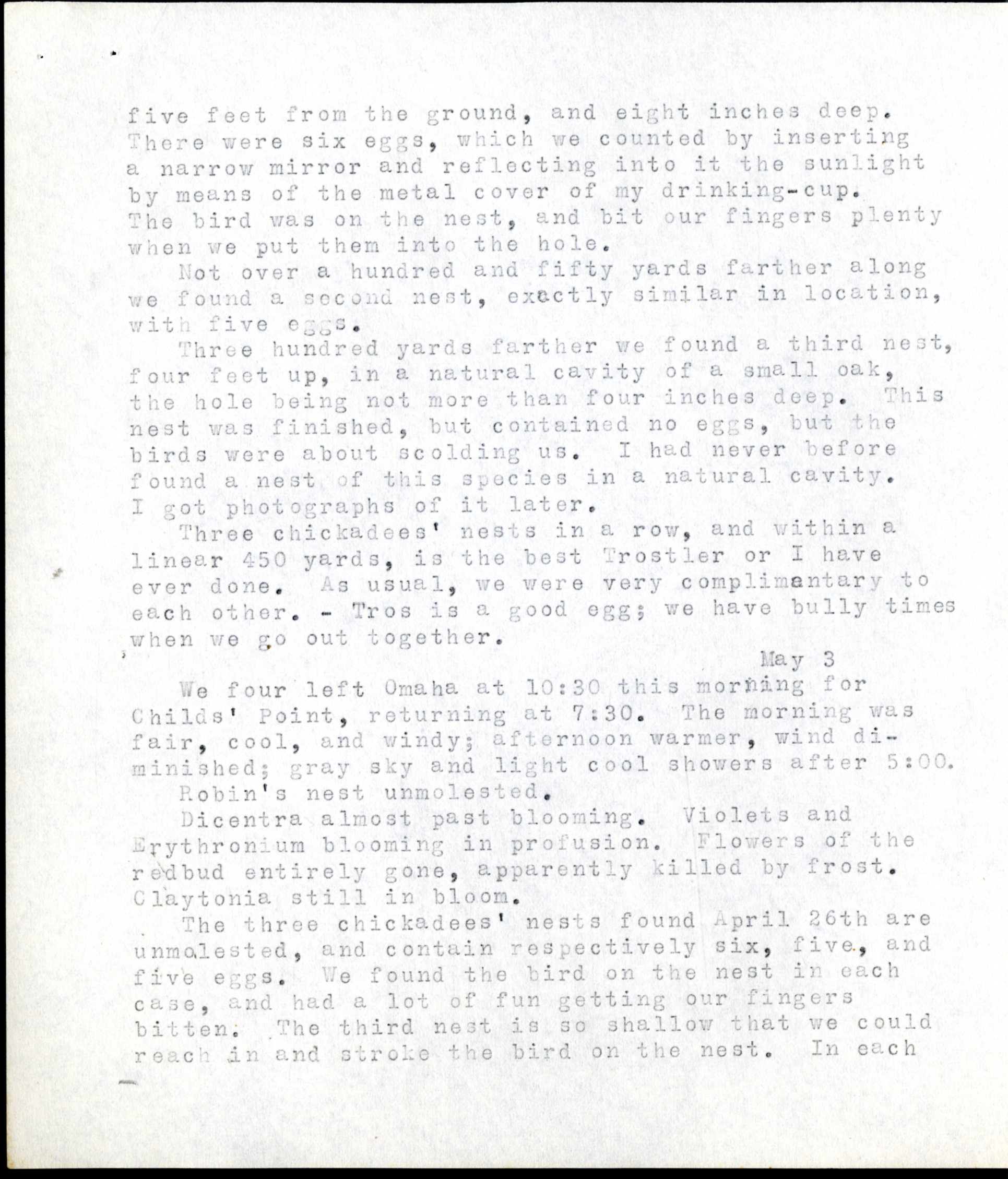 Frank H. Shoemaker typescript, 20 pages, detailing bird sightings, field trips, photography, and associated activities in Omaha, Nebraska.