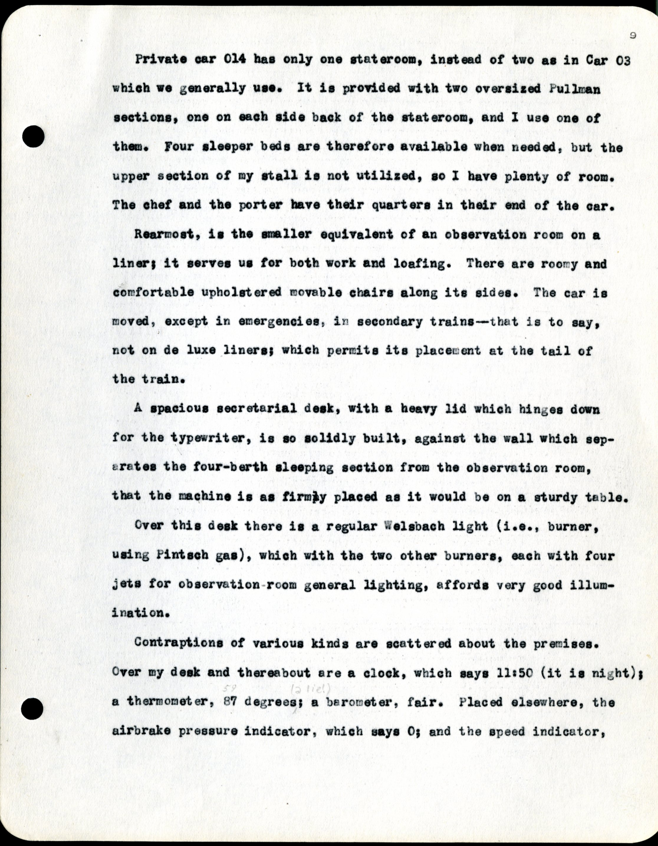 Frank H. Shoemaker typescript, 19 pages, noted on front page as "Have selected from my pocket day-dooks items pertaining to my leisure activities while on trips as private secretary to General Auditor of U.P.-S.P. and affiliates."