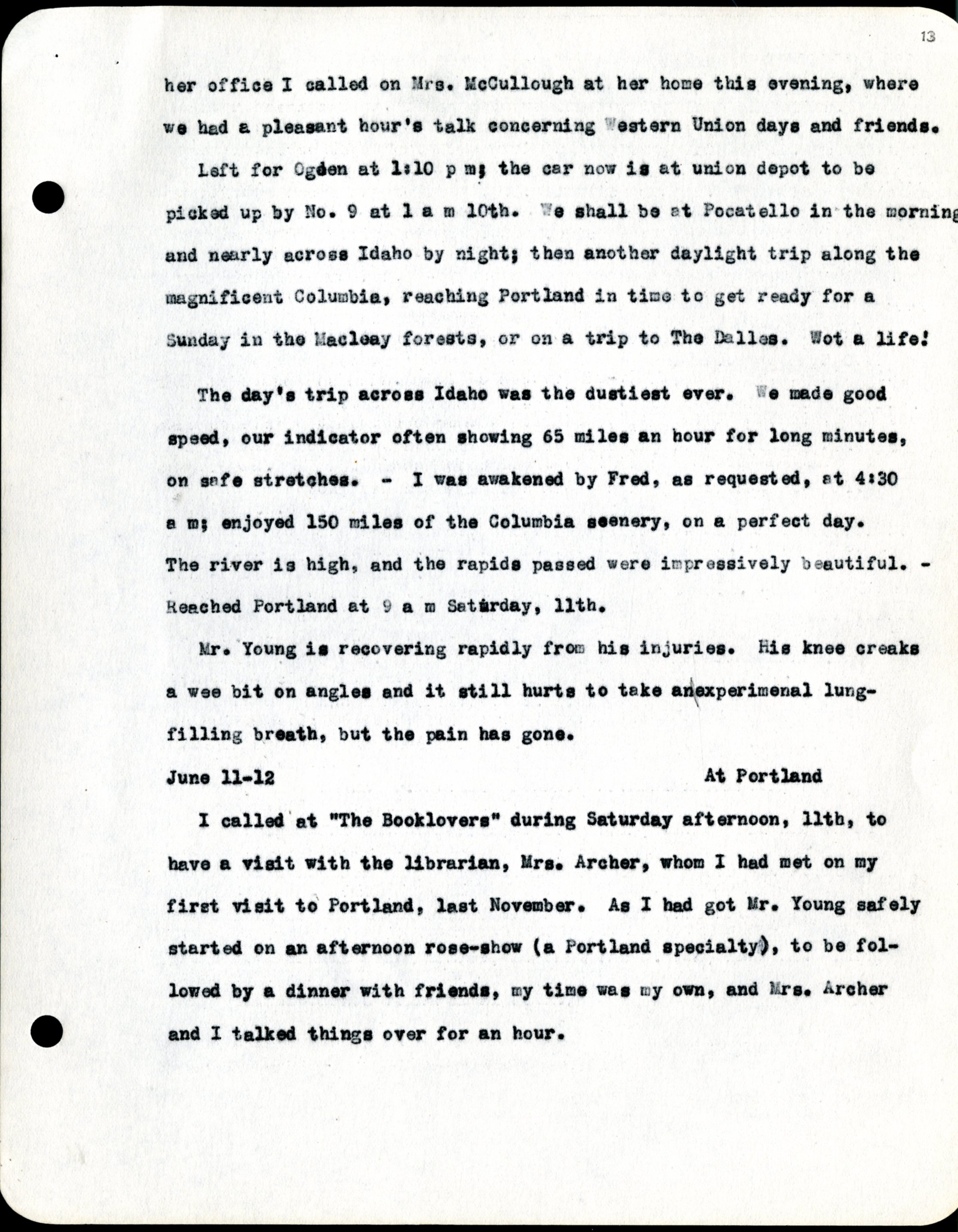 Frank H. Shoemaker typescript, 19 pages, noted on front page as "Have selected from my pocket day-dooks items pertaining to my leisure activities while on trips as private secretary to General Auditor of U.P.-S.P. and affiliates."