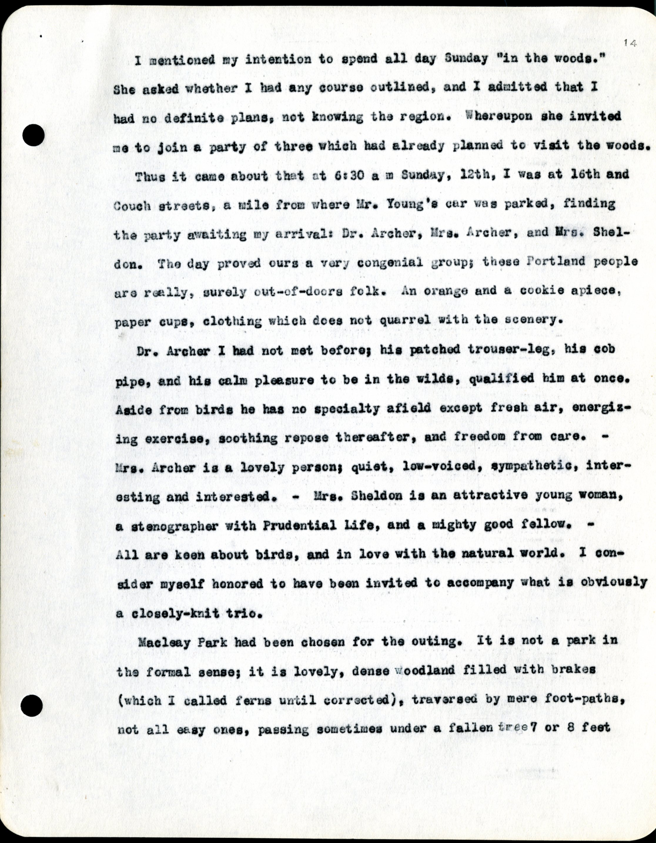 Frank H. Shoemaker typescript, 19 pages, noted on front page as "Have selected from my pocket day-dooks items pertaining to my leisure activities while on trips as private secretary to General Auditor of U.P.-S.P. and affiliates."