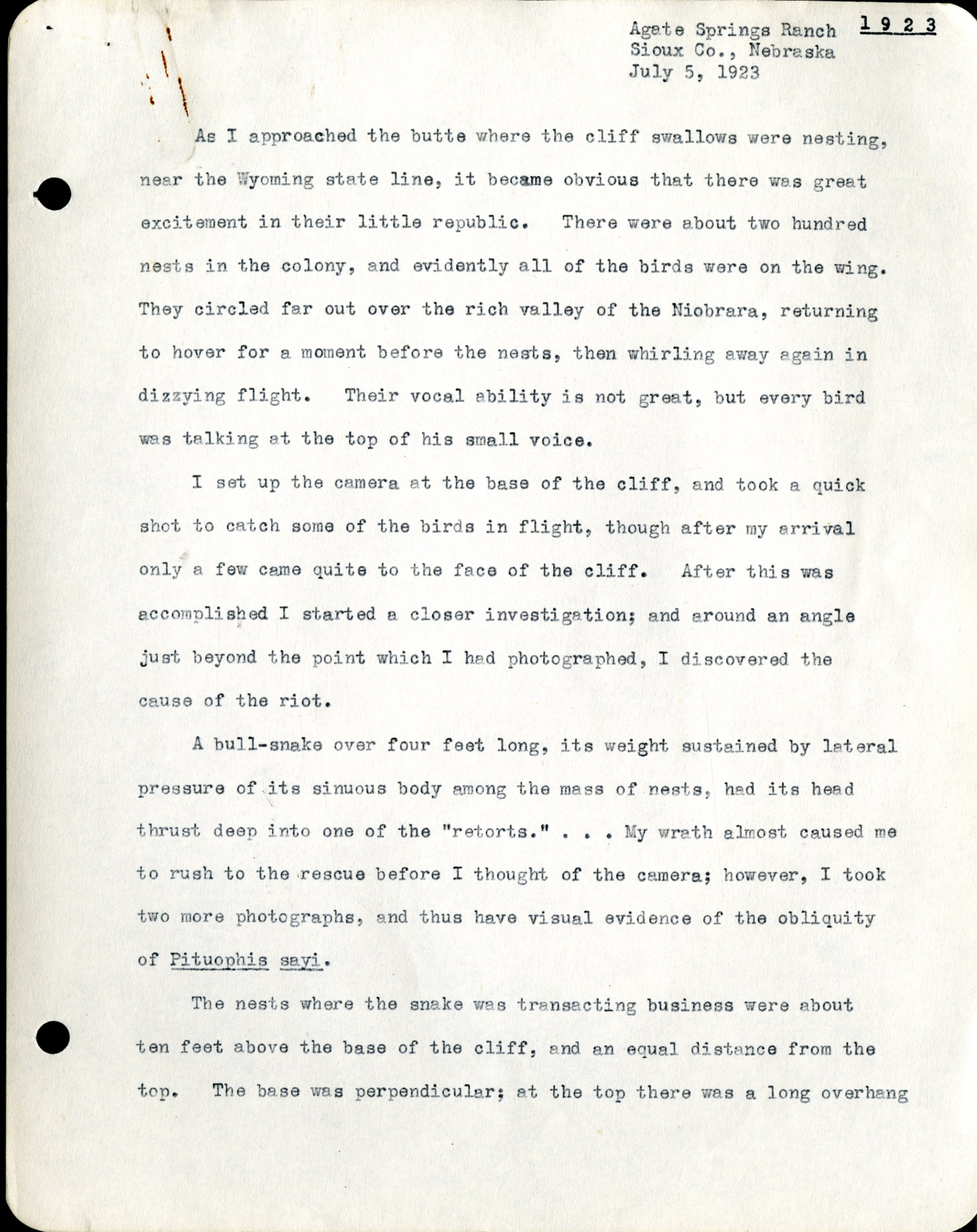Frank H. Shoemaker, typescript, 3 pages, on snake hunting in Cliff Swallow nests, with an accompanying note and photo.