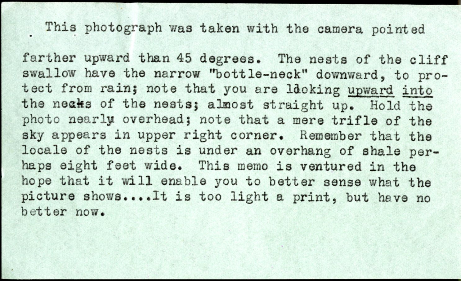 Frank H. Shoemaker, typescript, 3 pages, on snake hunting in Cliff Swallow nests, with an accompanying note and photo.