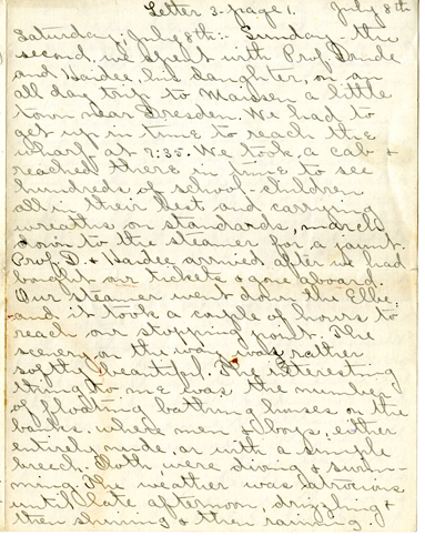 1 Saturday; July 8th: Sunday-the second, we spent with Prof. Drude and Haidee , his daughter, on an all day trip to Maissen a little town near Dresden . We had to get up in time to reach the wharf at 7:35. We took a cab & reached there in time to see hundreds of school-children all in their best and carrying wreaths on standards, march down to the steamer for a jaunt. Prof. D. & Haidee arrived after we had bought our tickets & gone aboard. Our steamer went down the Elbe, and it took a couple of hours to reach our stopping point. The scenery on the way was rather softly beautiful. The interesting thing to me was the number of floating bathing houses on the banks, where men & boys, either entirely nude, or with a simple breech-cloth, were diving & swimming. The weather was atrocious until late afternoon, drizzling & then shinning & then raining.